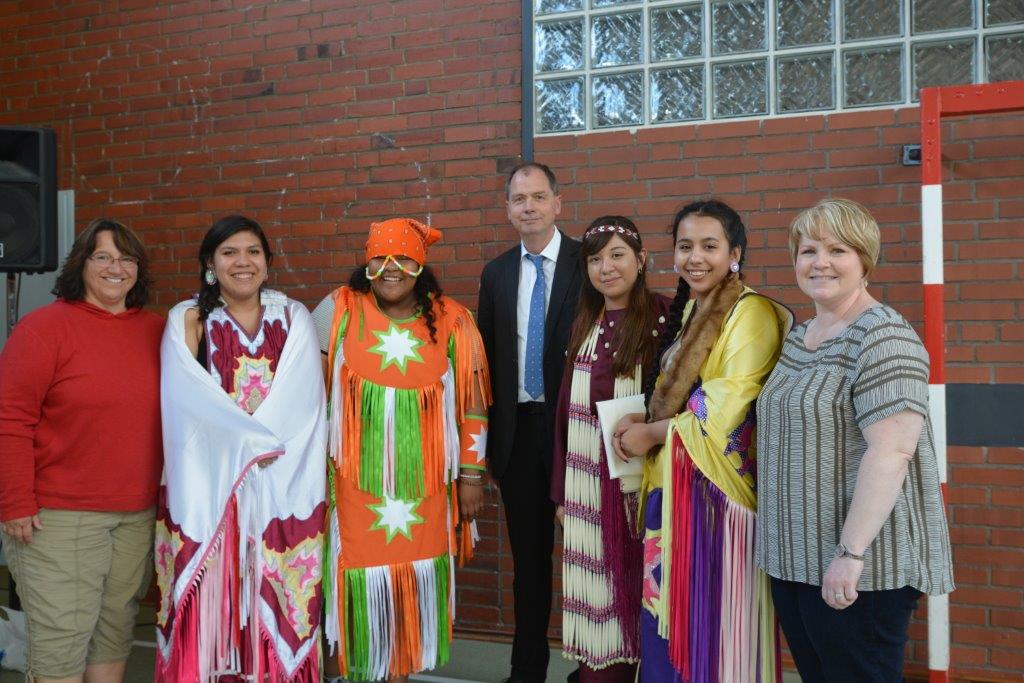 Die Schülerinnen aus South Dakota hatten für ihre Präsentationen in der Schule traditionelle indianische Festkleidung mitgebracht, die sie am jährlich stattfindenden Powow – einem Fest, an dem nordamerikanische Indianer sich treffen, um gemeinsam zu tanzen, zu singen, Kontakte zu knüpfen und die indianischen Kulturen zu ehren – tragen, und erläuterten deren Gestaltung und Funktionen. Schließlich zeigten sie einige typisch indianische Tänze und brachten so mit großem Enthusiasmus unseren Schülern einen Teil ihrer Kultur recht eindrucksvoll nahe.