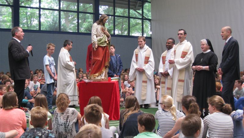 Jeweils am ersten Freitag im Juni feiern katholische Christen weltweit das Herz-Jesu-Fest. Für die Dehonianer, die Herz-Jesu-Priester, ist dieser Tag ein besonderer Festtag. Deshalb hat sich heute morgen in der ersten Stunde die gesamte Schulgemeinschaft des Leoninums in der neuen Turnhalle zu einem gemeinsamen Morgenlob versammelt. Obwohl es keine Vollversammlung war, gab es zum Abschluss auch noch ein Ständchen für die Geburtstagskinder und Jubilare dieser Woche: