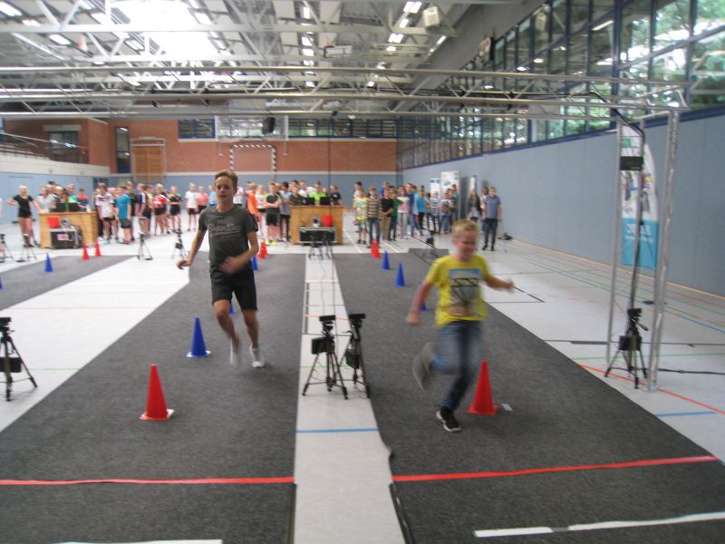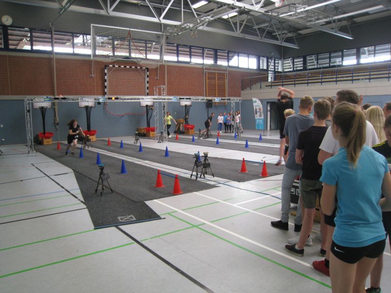 Mächtig was los war am heutigen Dienstag in der neuen Turnhalle des Leoninums, als die “aok-sports-tour” in Handrup Station machte: Reaktionsschneller Start, Sprint, Wurf auf einen Basketballkorb (treffen!), Sprint im Slalom zurück. Die elektronische Zeitmessung bekam jeder als Ausdruck, dann konnte man sich für den nächsten Versuch anstellen. Kein Wunder, dass die Bestmarken reihenweise purzelten.
