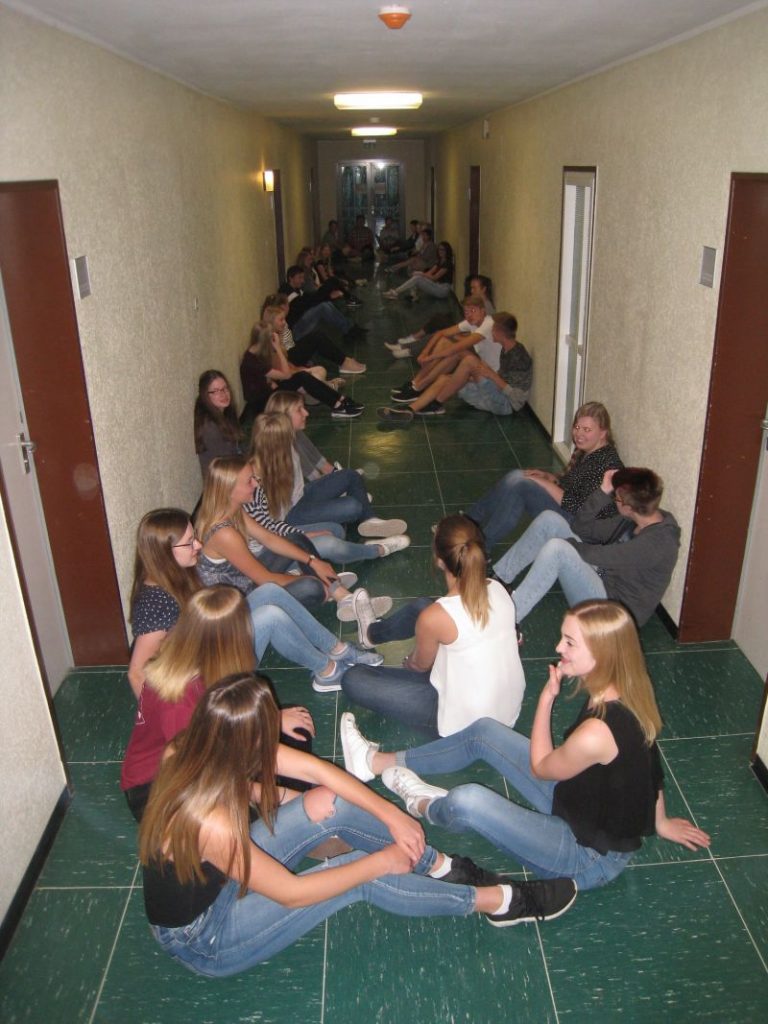 30 Mann, 30 Tage – das war die Aufgabe der “Proviantmeister” von Christoph Kolumbus: Wie viel und welchen Proviant sollte man auf eine Seereise nach Indien mit an Bord nehmen? 2000 l Trinkwasser – das macht Sinn; Bier und Rum – dafür spricht die bessere Haltbarkeit. Doch jetzt ist auch noch der zur Verfügung stehende Raum zu beachten: Die “Nina” und die “Pinta” waren nur ca. 20 m lang – exakt so lang wie die Flure in der Kursetage des Leoninums. Zugegeben: Die Schiffe waren bis zu 7 m breit und hatten Ober- und Unterdeck. Dennoch mussten ja auch noch (Pökel-)Fleisch, getrockene Fische, Brot und Gemüse verstaut werden. Für den Fall von Konflikten hatte Kolumbus auch Waffen, Kanonen und Munition an Bord. Mit all der Ladung muss die Situation an Bord kaum erträglich gewesen sein (tatsächlich gab es immer wieder Meutereien gegen Kolumbus). Zur Verdeutlichung der Platzverhältnisse verteilen sich hier 30 Oberstufenschülerinnen und -schüler auf dem 20 m langen Flur: