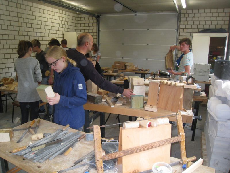 Damit das Ganze nicht zu theoretisch war, wurde in der Zwischenzeit gruppenweise an der Anfertigung von Schachfiguren für ein bereits vorhandenes Schachfeld vor dem Refektorium gearbeitet.