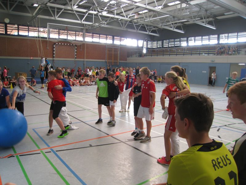 Eine kleine Handruper Farbenlehre konnte man heute in der neuen Sporthalle beobachten: Da gab es Bayern-Rot, Dortmund-Gelb, Bremen-Grün, Schalke-Blau, Deutschland-Weiß, … Und das Schöne: Bei Spielen wie “Dreibein-Fußball” traten die verschiedenen Farben nicht gegeneinander, sondern oft genug Arm in Arm an: