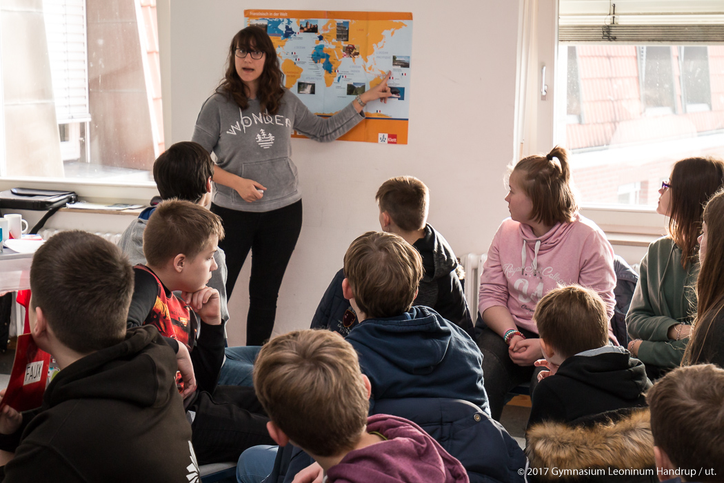 Das FranceMobil hat am Gymnasium Leoninum Station gemacht. Den Besuch hatte die Fachruppe Französisch organisiert, um den Schülern des Jahrgangs 7 ein zeitgemäßes Frankreichbild zu vermitteln und zur Wahl der dritten Fremdsprache zu motivieren.