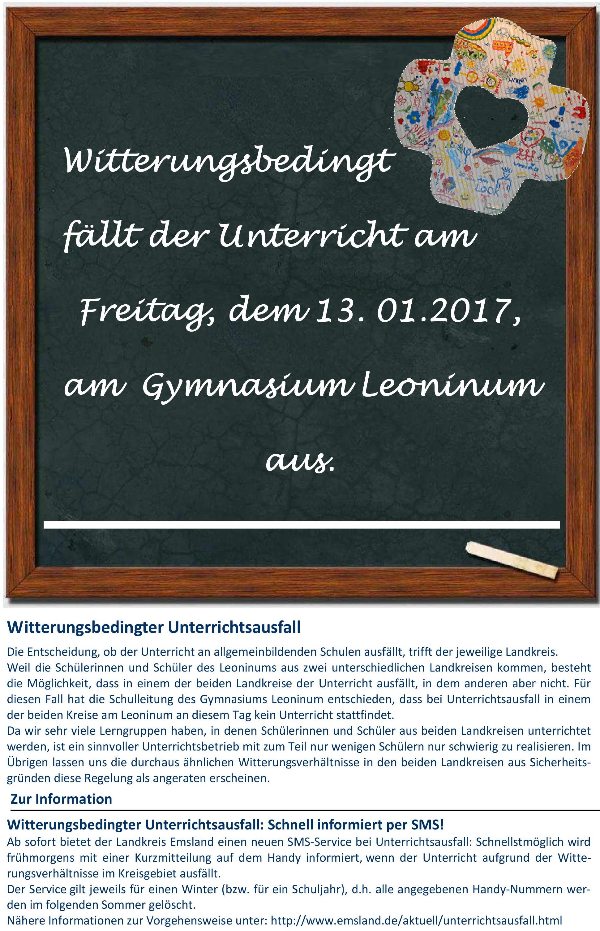 Heute: Witterungsbedingter Unterrichtsausfall 13. Januar 2017 | Administrator | Kategorien: Vergangene Aktionen Gymnasium Leoninum Handrup Leoninum Unterrichtsausfall