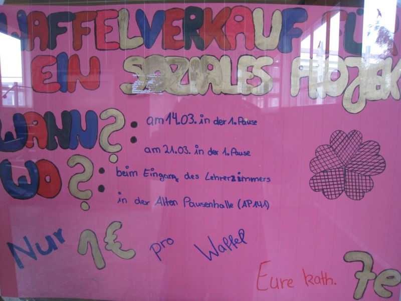Am kommenden Dienstag (14. März) und in der Woche darauf ebenfalls am Dienstag (21. März) verkauft die Klasse 7 e jeweils in der ersten großen Pause leckere Waffeln. Den Erlös dieser tollen Aktion will die Klasse an die Obdachlosenhilfe des SKM Lingen spenden!