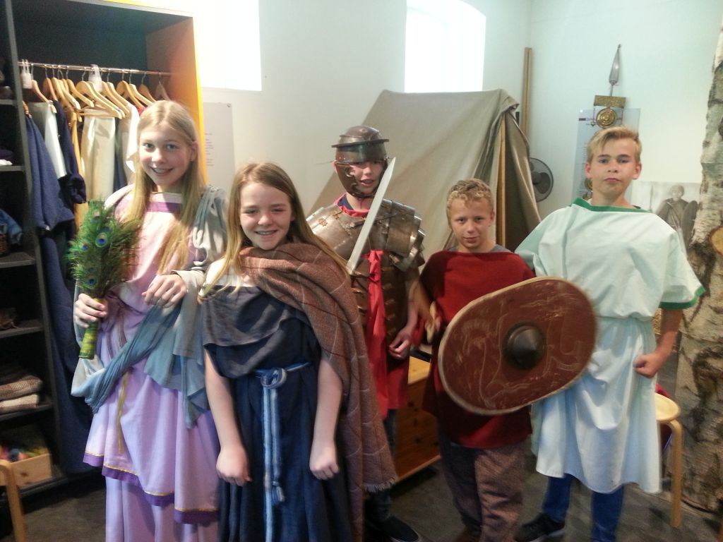 Wenn man schon “Weltgeschichte vor der Haustür” hat …, dann muss man das auch ausnutzen! Und so fahren seit einigen Jahren die 6. Klassen des Leoninums im Rahmen ihres Geschichtsunterrichts (dann stehen nämlich die Römer und Germanen auf dem Lehrplan) nach Kalkriese an den Schauplatz der Varusschlacht. Heute war es wieder so weit und wie das folgende Foto zeigt, gab es nicht nur lehrreiche Informationen, sondern auch lustige Mitmach-Aktionen: