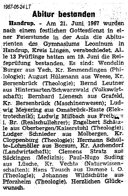 Im Juni 1967 haben dann 13 dieser jungen Männer in Handrup ihr Abiturzeugnis erhalten, zwei Kameraden – nach Verweis von Schule und Internat – woanders. Von den 15 sind bereits vier verstorben. Nur einer der Lebenden war jetzt verhindert, sodass noch 10 in Mesch zum Jubiläum zugegen waren. Ihm und den verhinderten Klassenlehrer Lindemann und Naturkundelehrer Hockmann schickten die Teilnehmer eine Grußkarte.