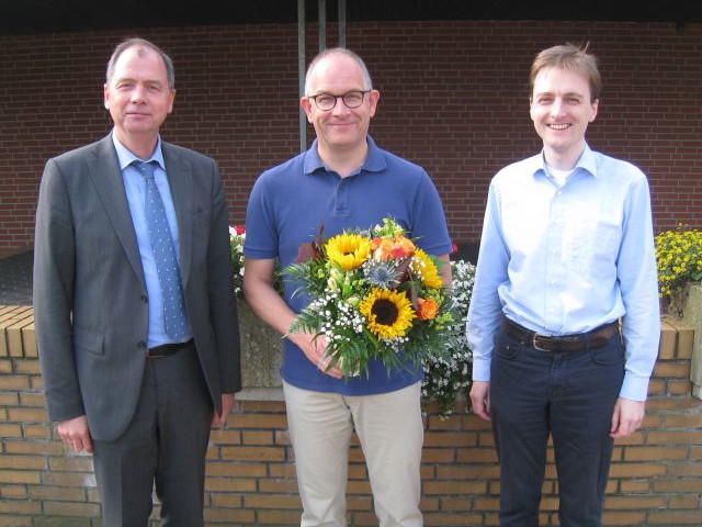 Am heutigen Montag feierte Herr Jens Plock sein 20-jähriges Dienstjubiläum am Gymnasium Leoninum. Der Schulleiter Herr Hanneken und Pater Kreutzmann für das Herz-Jesu-Kloster Handrup gratulierten mit einem bunten Blumenstrauß.