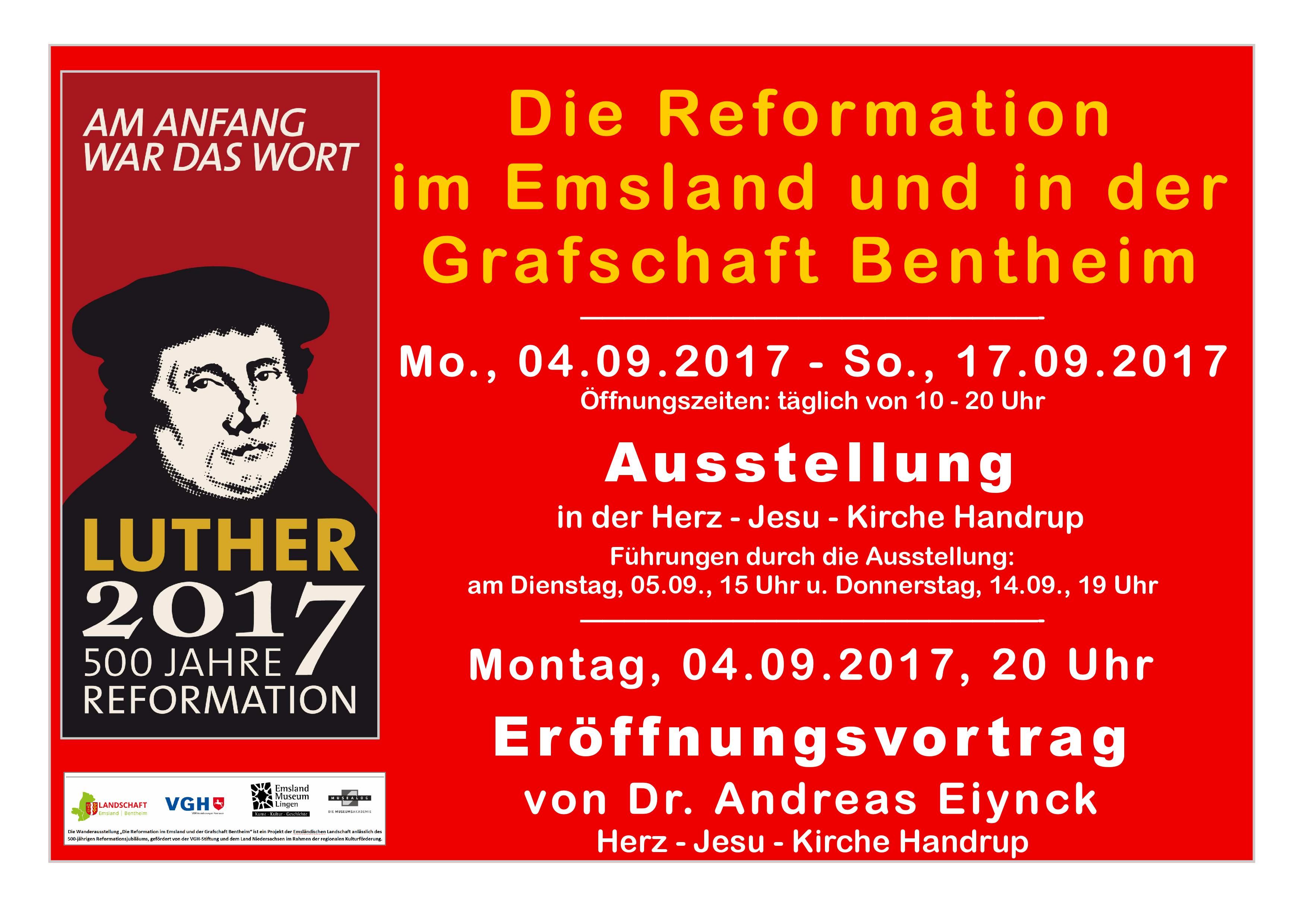 Anlässlich des Reformationsjahres hat die Emsländischen Landschaft unter Leitung von Dr. Andreas Eiynck eine Wanderausstellung konzipiert, die anhand von 18 Informationstafeln die Entwicklung und die Auswirkungen der Reformation in der Grafschaft Bentheim und im Emsland veranschaulicht.