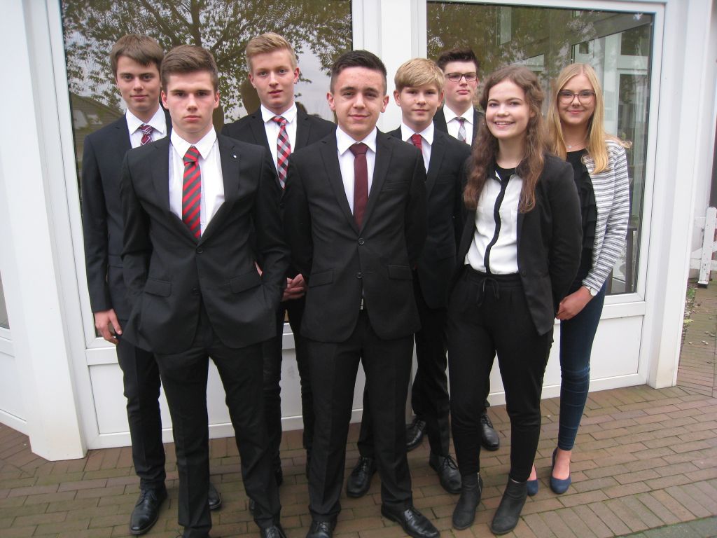 Der Marketing-Abend beim Management Information Game fordert von den teilnehmenden Schülerinnen und Schülern einiges – auch in Hinsicht der Kleidung: Hier präsentiert sich die Firma “Corona” selbstbewusst vor der Präsentation eines innovativen Bürostuhls. Ob es zum Sieg gereicht hat?