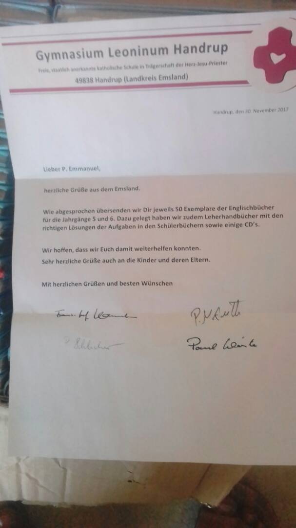 Einer Idee aus einem Gespräch mit dem Elternvorstand folgend, beabsichtigen wir nun nach Rücksprache mit P. Emmanuel, ihm diese bei uns nicht mehr benötigten Schulbücher für seinen Englisch-Anfangsunterricht zur Verfügung zu stellen.