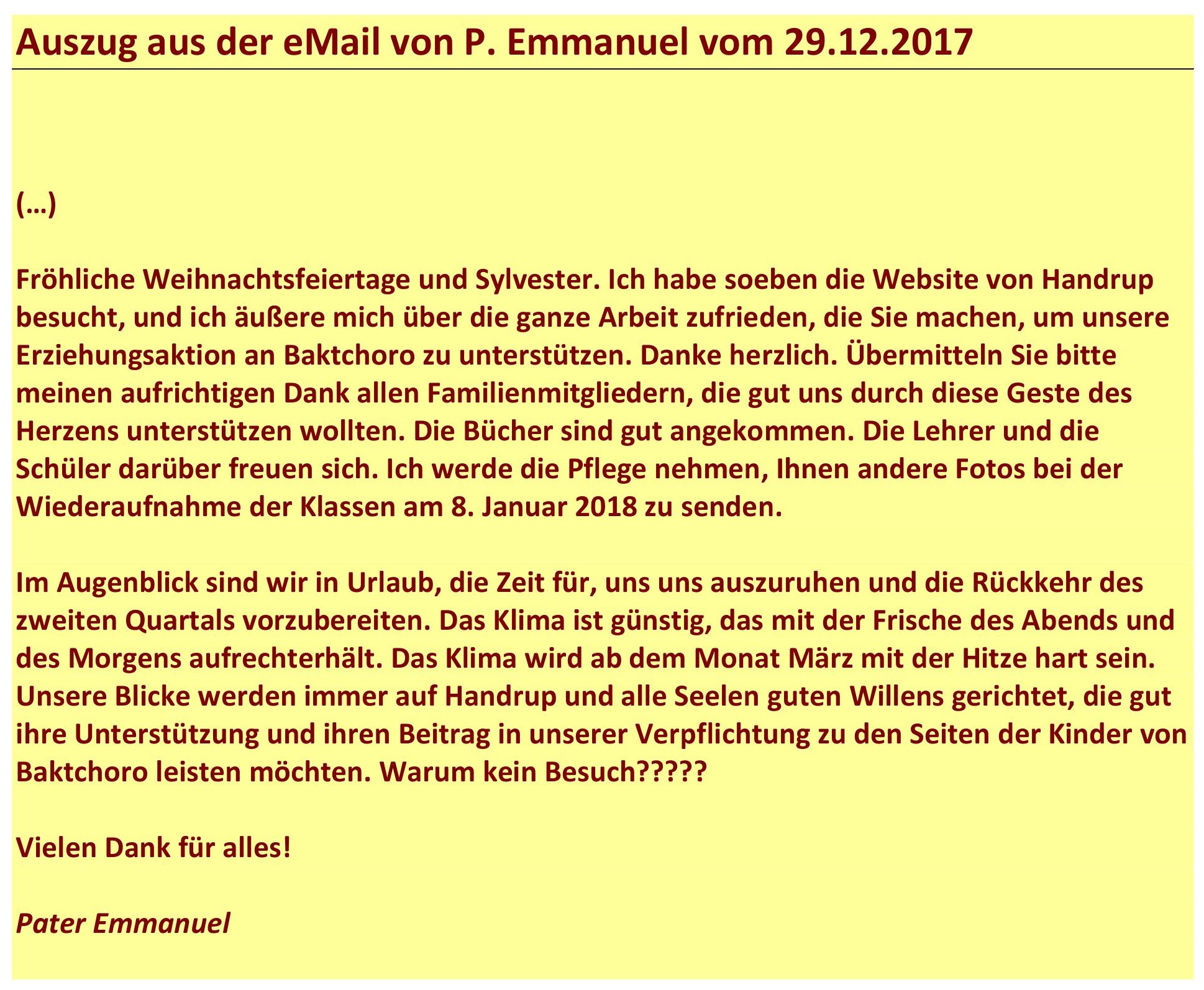 Da weiterhin gute Kontakte zwischen Kloster und Schule in Handrup und P. Emmanuel bestehen, sind wir über die Situation an seiner Schule recht gut informiert und wissen, unter welchen Bedingungen dort vor Ort Schule betrieben wird.