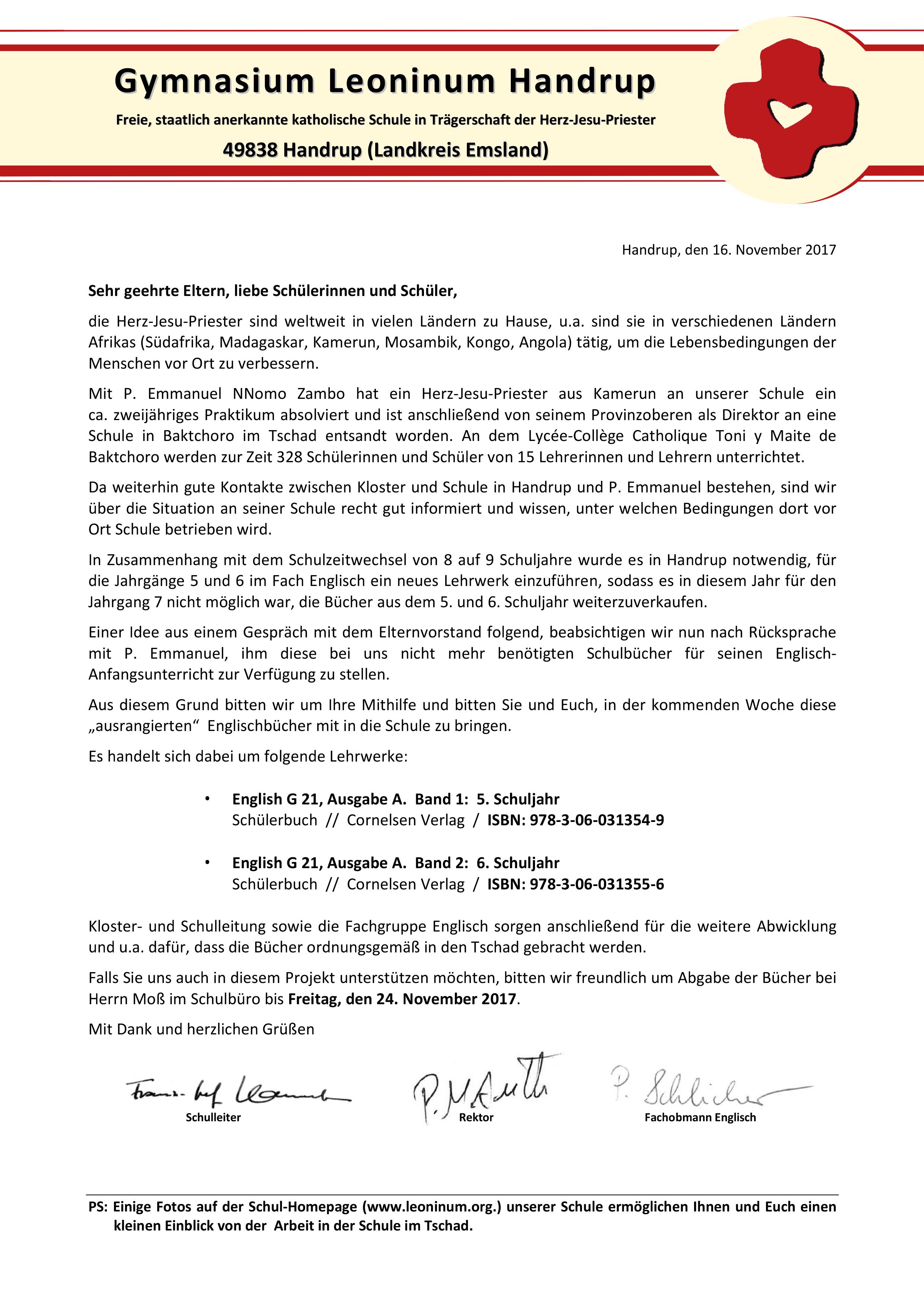 Kloster- und Schulleitung sowie die Fachgruppe Englisch sorgen anschließend für die weitere Abwicklung und u.a. dafür, dass die Bücher ordnungsgemäß in den Tschad gebracht werden.