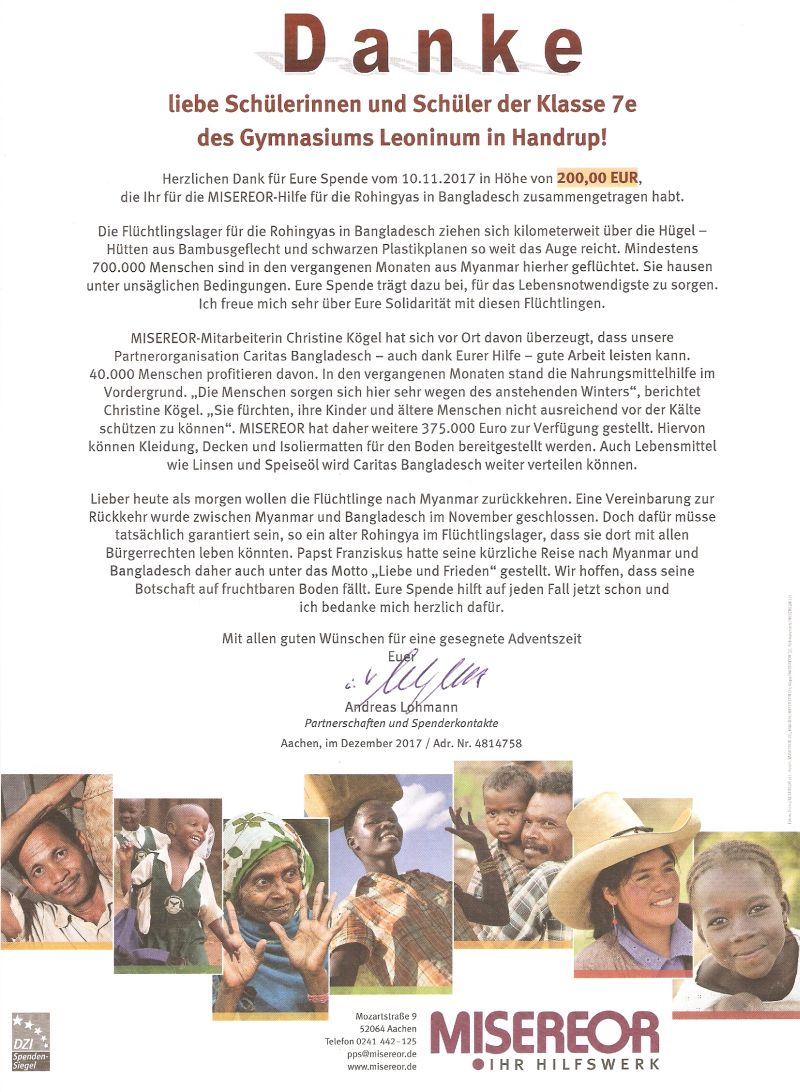 Die Nachrichten über die schlimme Lage der Rohingyas in den Flüchtlinglagern von Bangladesh haben viele Menschen auf der ganzen Welt bewegt. Die Klasse 7 e des Leoninums wurde tätig und verkaufte auf dem Schulhof Waffeln zugunsten der Flüchtlinge aus Myanmar. So wurden 200 € erwirtschaftet, die auf ein Hilfskonto von Misereor überwiesen wurden. Jetzt bedankte sich das Hilfswerk mit einer “Urkunde”:
