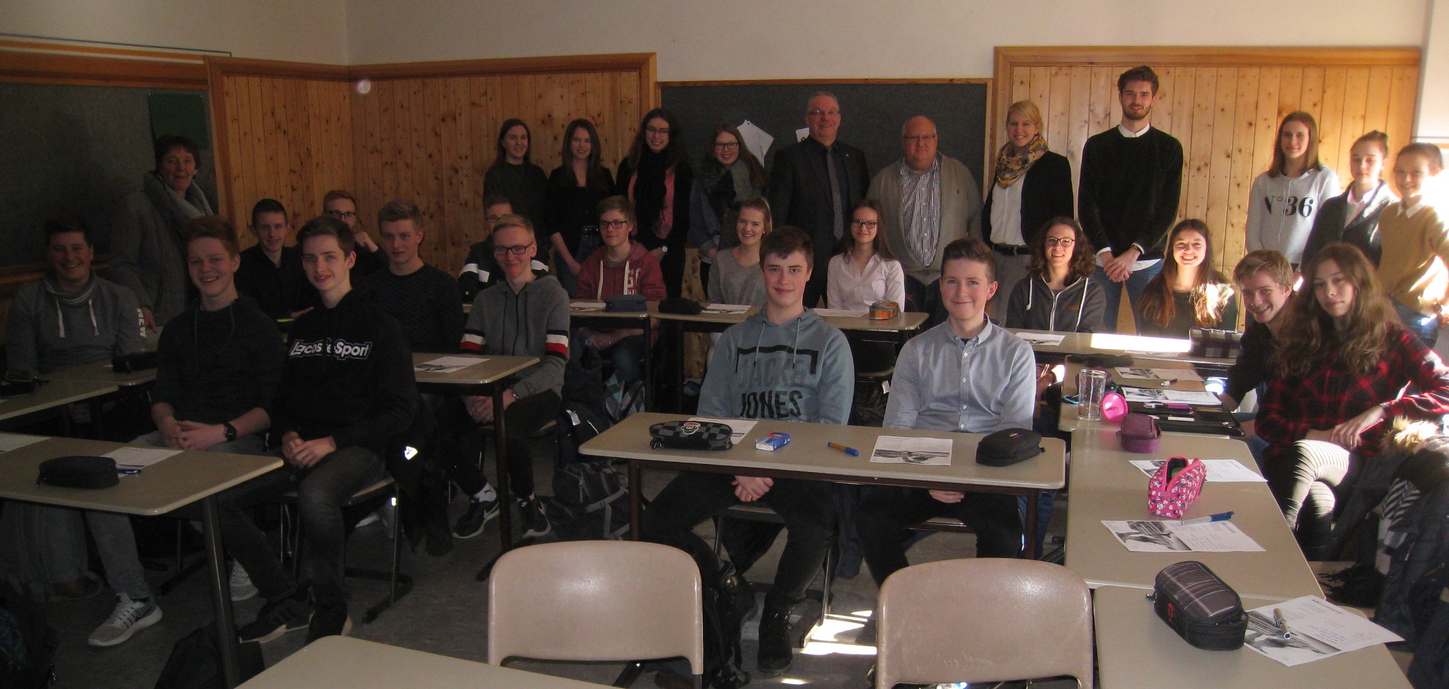 Beim Assessment Center, das am vorigen Freitag zum wiederholten Mal am Gymnasium Leoninum mit Unterstützung der Barmer GEK und der Volksbank Süd-Emsland eG durchgeführt wurde, handelt es sich um eine Methode zur Einschätzung von Personen vor allem in den Bereichen der Personalauswahl und Personalentwicklung. Durch Arbeitssimulationen und andere Übungen (Rollenspiele, Gruppendiskussionen, Präsentationen u. a.) und deren Bewertung durch geschulte Beobachter (“Assessoren”) können Personaleinschätzungen entwickelt werden. Das Foto zeigt die teilnehmende Schülergruppe mit den Referenten Kerstin Schwering und Marvin Hammor von der BARMER und Richard Niermann von der Volksbank Süd-Emsland sowie der Koordinatorin Frau Zapf und dem stellvertretenden Schulleiter Herrn Wöste:
