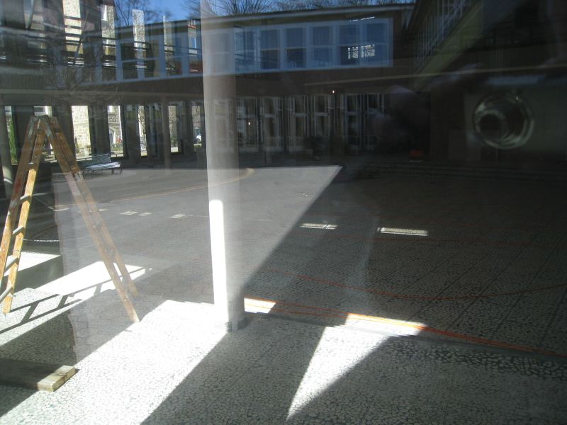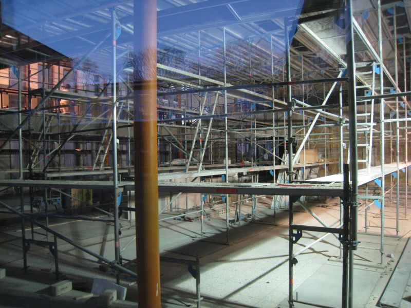 Gleich zwei Baustellen zeigt dieses Foto: Unseren neuen Aula-Trakt und die geplante Schulfahrt nach Spanien. An beiden Baustellen wurde in den Osterferien viel gearbeitet. Hier zunächst ein Foto ins Innere der Aula vor den Osterferien: