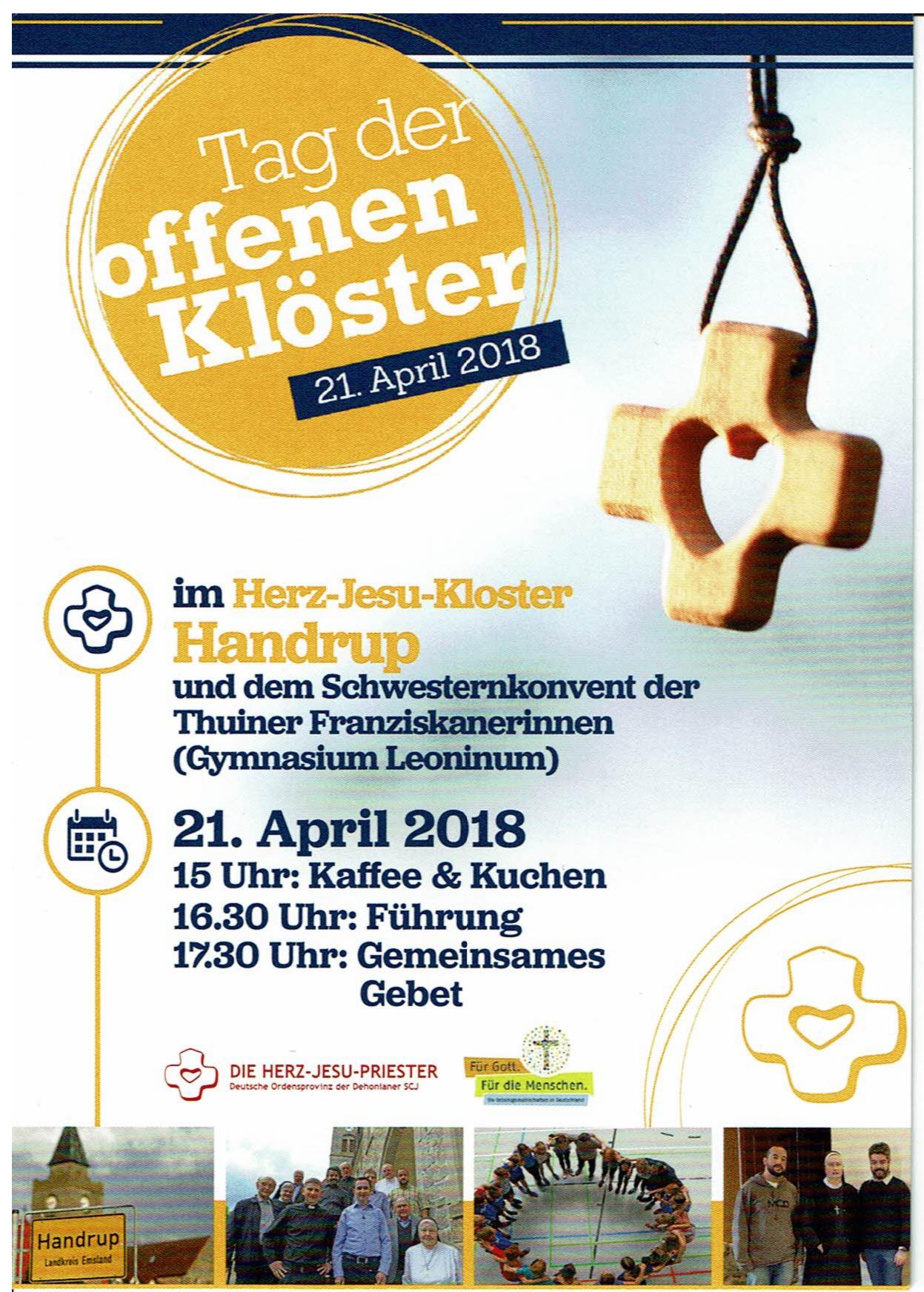 “Tag der offenen Klöster” auch im Herz-Jesu-Kloster Handrup – Vor- und Nachbericht 10. April 2018 | Administrator | Kategorien: Aktuelles VORBERICHT IN DER LINGENER TAGESPOST (v. 16.04.2018): https://www.noz.de/lokales/lengerich/artikel/1191471/handruper-kloster-erwartet-am-21-april-viele-gaeste#gallery&0&0&1191471 NACHBERICHT IN DER LINGENER TAGESPOST (v. 24.04.2018): https://www.noz.de/lokales/lengerich/artikel/1196919/170-besucher-beim-tag-der-offenen-kloester-in-handrup#gallery&0&0&1196919