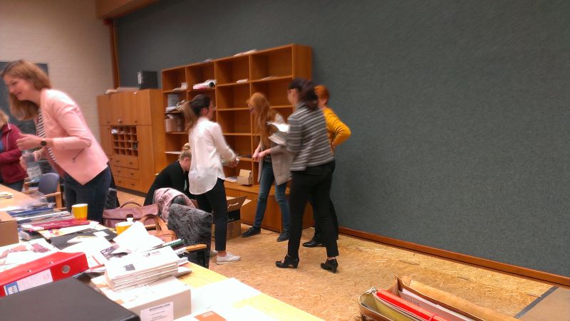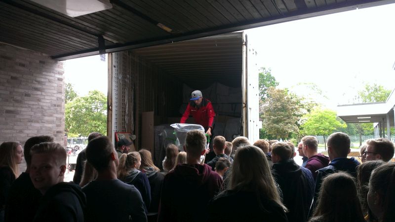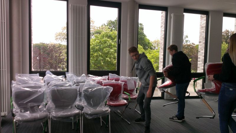Viele helfende Hände packten mit an, als am letzten Schultag vor Pfingsten das Lehrerzimmer aus dem Provisorium Gymnastikhalle in das neue Aula-Gebäude umzog. Während im bisherigen Lehrerzimmer die Fächer ausgeräumt und die Regale abgebaut wurden, war bereits der LKW mit den neuen Möbeln vorgefahren. Wohin damit? Ach, erst mal an die Seite stellen – da sind ja noch Handwerker am Arbeiten …