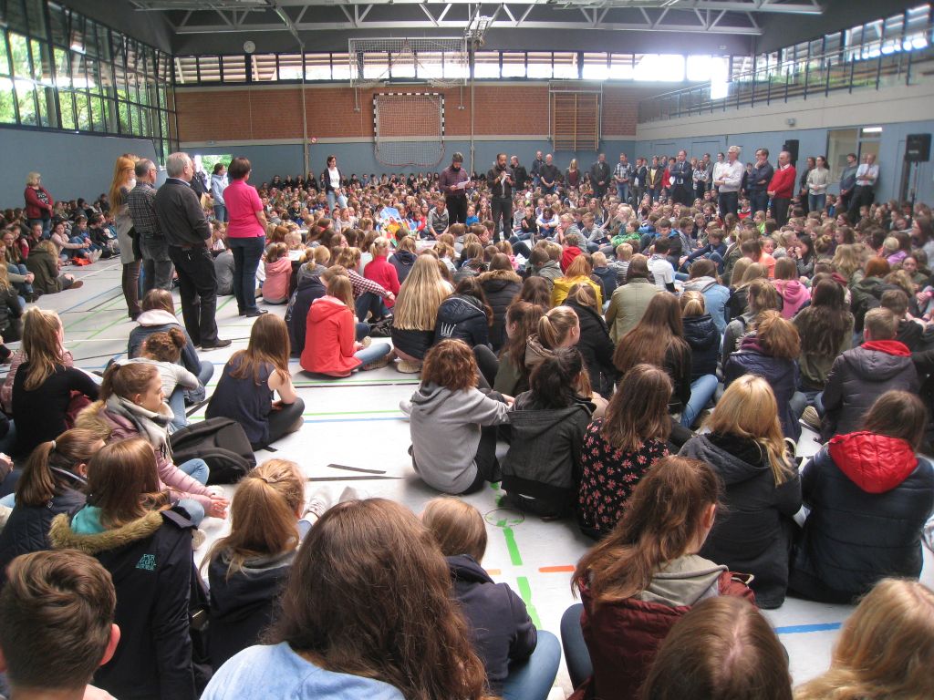 Sollte das heute wirklich unsere letzte Vollversammlung in der neuen Sporthalle gewesen sein? Herr Hanneken machte heute so eine Andeutung, dass Anfang Juni die neue Aula vielleicht schon fertig sein könnte. Also, ich fand’s gar nicht so schlecht in der Sporthalle und habe schnell noch ein Foto gemacht. Aber auf die neue Aula sind wir natürlich alle gespannt!