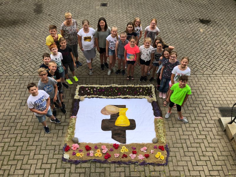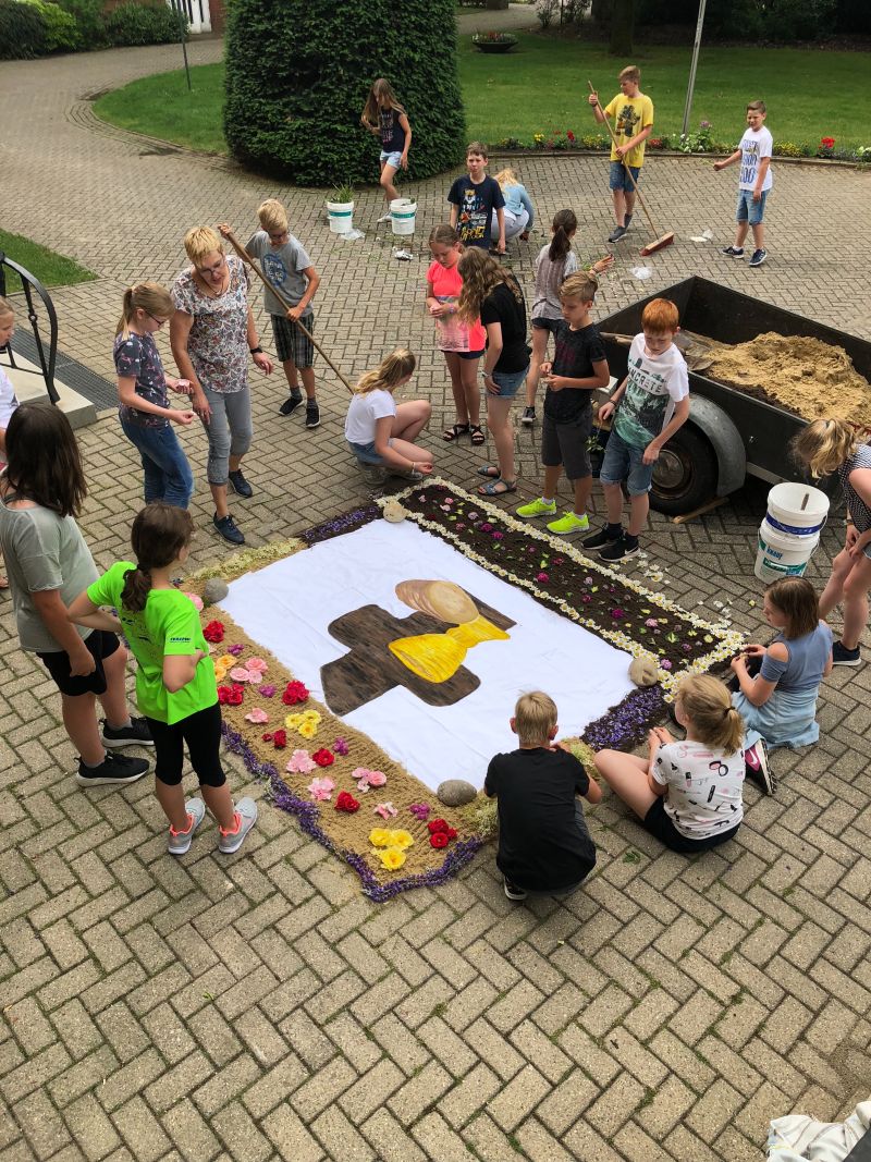 Mit fleißiger Hilfe von Schülerinnen und Schülern einer 5. Klasse hat Frau Meemann heute vor dem Haupteingang des Handruper Herz-Jesu-Klosters wieder einen Blumenteppich erstellt, der in diesem Jahr “Brot und Wein” als Motiv hat: