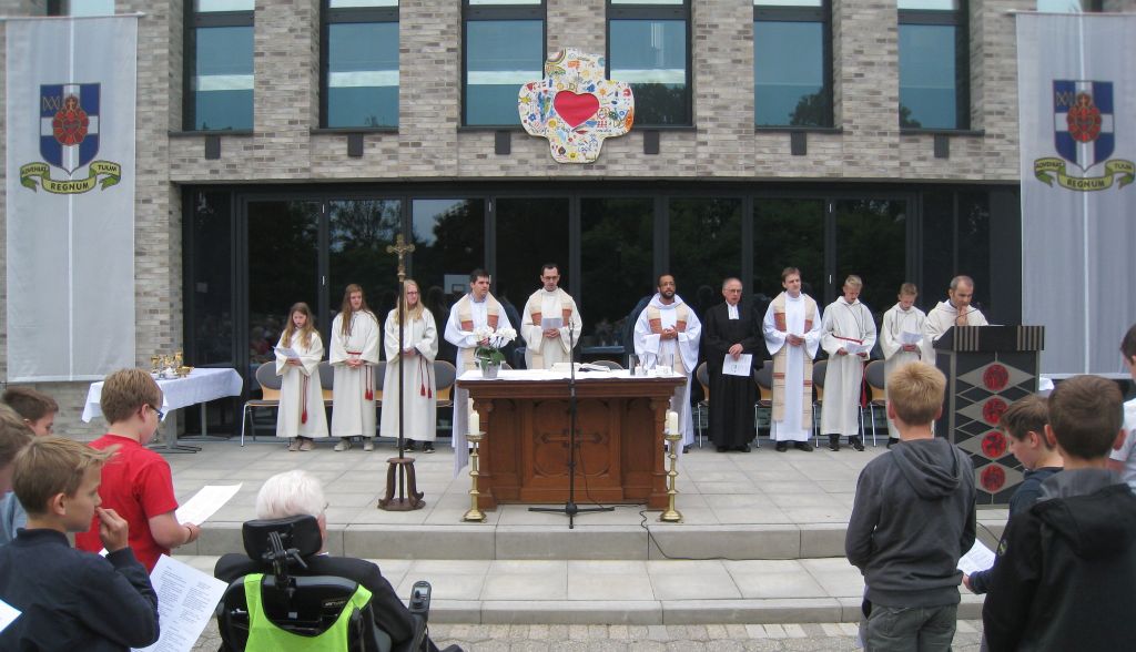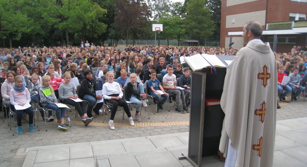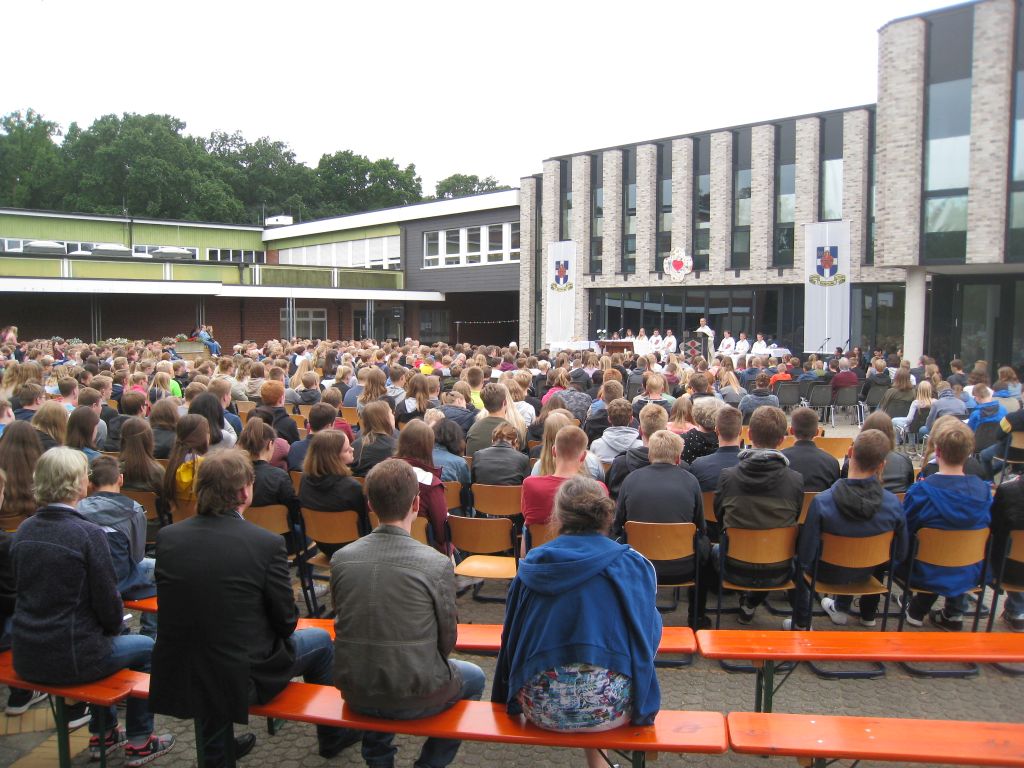 Die Predigt hielt unser ehemaliger Schulseelsorger P. Levi, der aus Freiburg angereist war. Die Technik und der gesamte Ablauf klappten sehr gut. Falls das eine Generalprobe für unseren Aussendungs-Gottesdienst am 10. September vor der Schulfahrt nach Spanien war, dann war sie sehr gelungen.