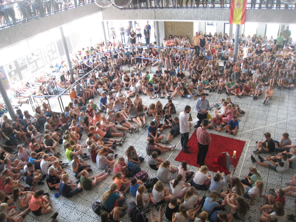 Nachdem die neue Aula ihre erste Bewährungsprobe bereits beim Erasmus-Treffen mit den Präsentationen der Schülergruppen aus Spanien, Frankreich, Belgien und Spanien bestanden hatte, fand nun auch die erste Vollversammlung des Leoninums in der neuen Aula statt. Auch wenn im Hintergrund noch einzelne Handwerker mit letzten Arbeiten beschäftigt waren, hat doch alles reibungslos geklappt. Die Vollversammlung ist wieder “zu Hause”! Thematisch ging es in der Vollversammlung um das Sportfest, das Sommerfest und weitere Informationen und Planungen für die große Schulfahrt nach Spanien.