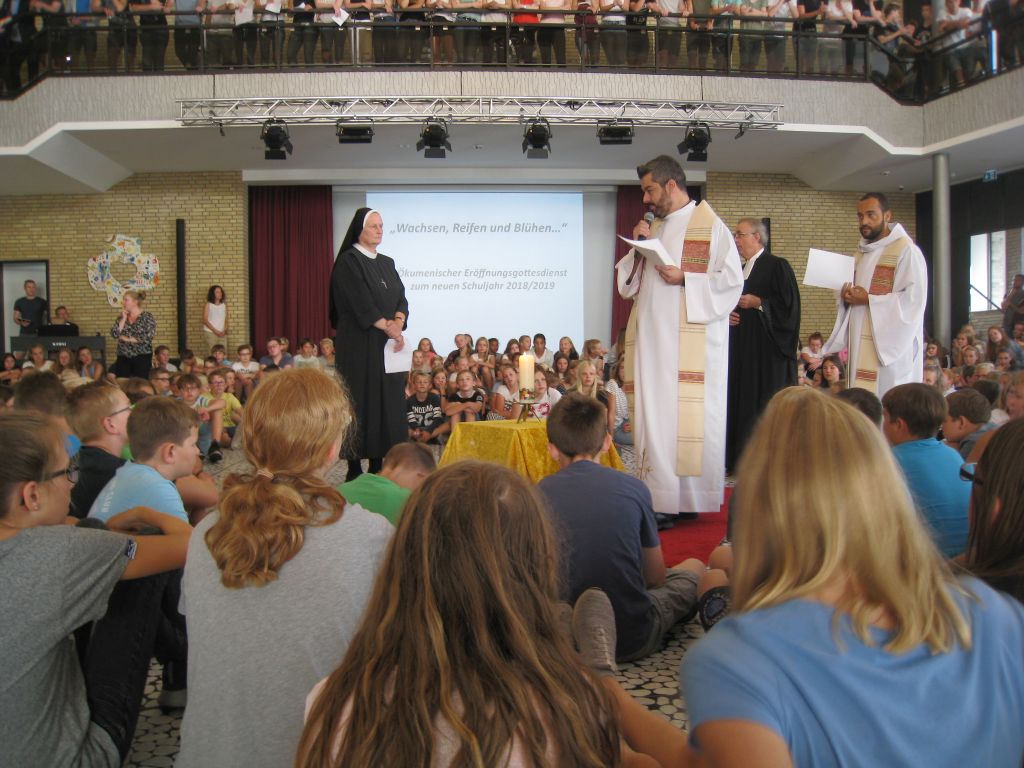 Nach zwei Klassenlehrer/TG-Stunden begann das neue Schuljahr am Gymnasium Leoninum mit einem ökumenischen Eröffnungsgottesdienst in der Aula unter dem Motto “Wachsen, Reifen, Blühen …”. Dabei standen Erlebnisse aus den Ferien und Wünsche für das neue Schuljahr im Vordergrund. Auch wenn es im Vorfeld immer wieder geheißen hatte, dass die Ferien zu kurz waren, so war doch offensichtlich, dass es viel zu erzählen gab. Der Start ist schon mal geglückt, jetzt freuen wir uns und begrüßen morgen die neuen Fünftklässler!