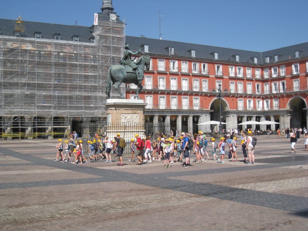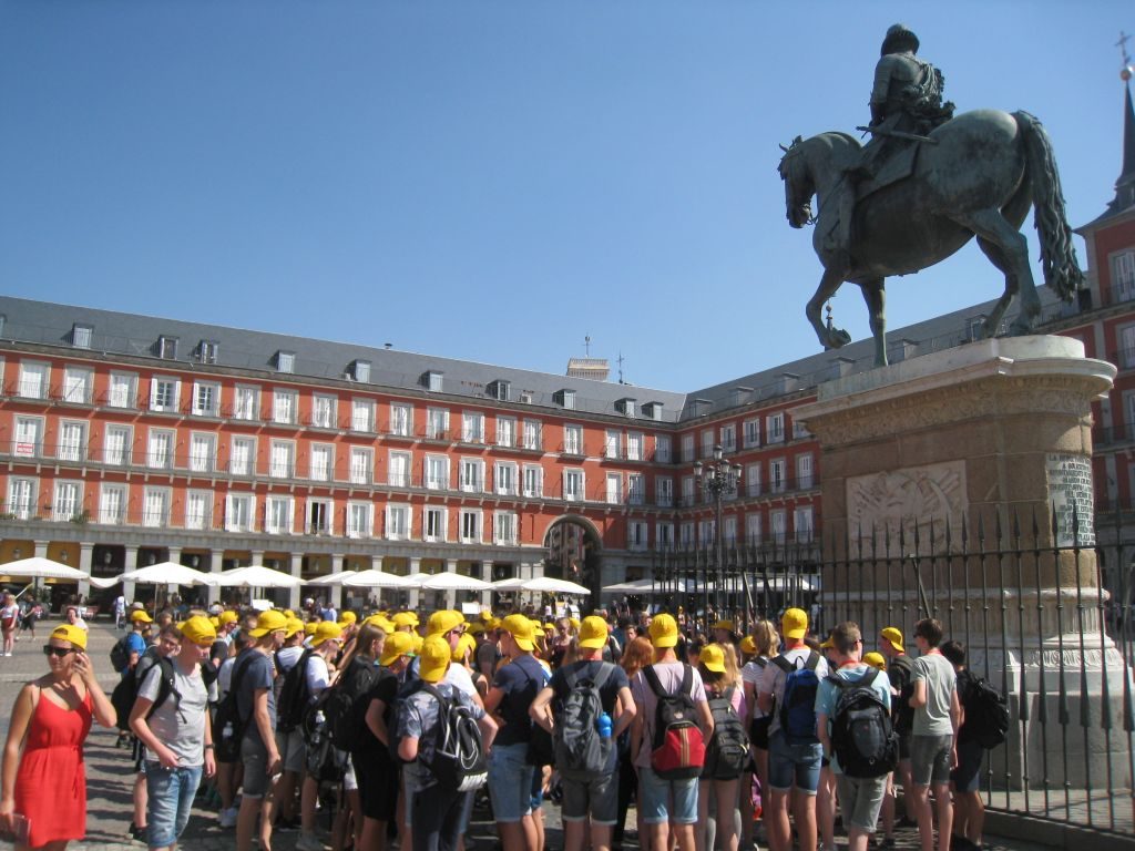 Gut und schon von weitem sichtbar sind sie ja, unsere neuen, von Bischof Wübbe beim Aussendungsgottesdienst gesegneten gelben Caps. Und so machte es sich echt “bezahlt”, dass bei der Fahrt nach Madrid (fast) alle Schülerinnen und Schüler diese Caps aufhatten. Und bei dem herrlich-heißen Sonnenwetter war das sowieso besser …