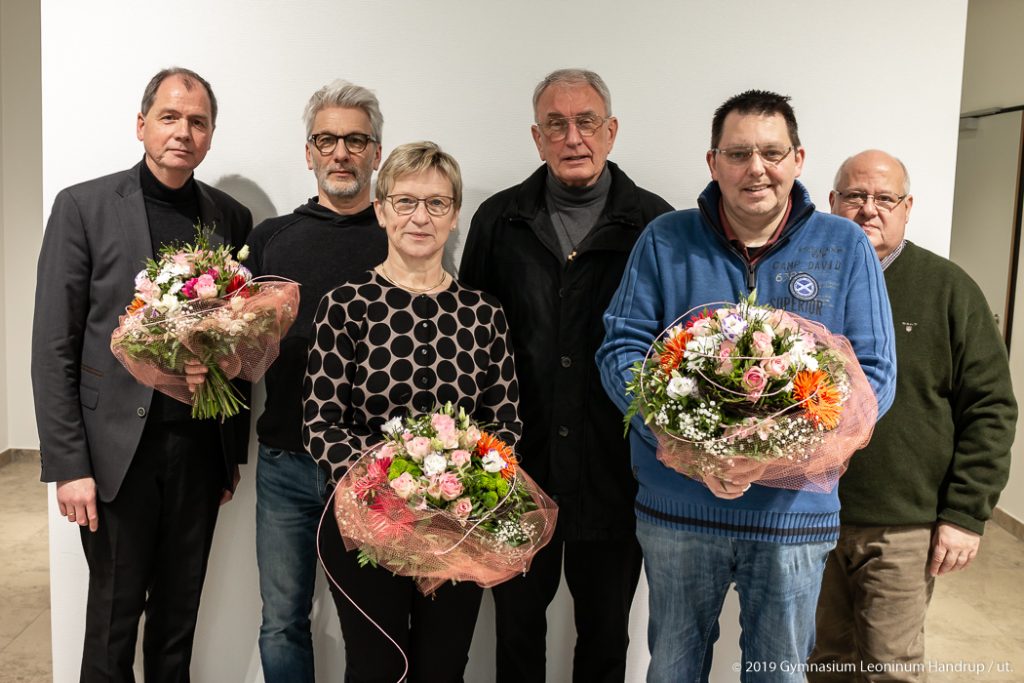 Auf insgesamt 65 Dienstjahre kommen die drei Jubilare, denen der Schulleiter Herr Hanneken in der Februar-Vollversammlung für treue und engagierte Dienste dankte: Die Schul-Sekretärin Frau Ahrens und der Schul-Sekretär Herr Moß sind jeweils seit nunmehr 20 Jahren für das Gymnasium Leoninum tätig. Herr Boensch wurde vor 25 Jahren eingestellt und arbeitet seit etlichen Jahren auch als Vertrauenslehrer. Dem Dank schlossen sich auch der Rektor des Herz-Jesu-Klosters P. Hülsmann und der stellvertrende Schulleiter Herr Wöste an: