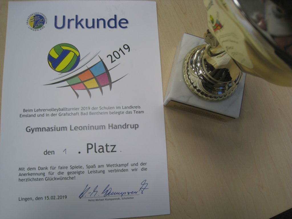 Diese Urkunde und der Pokal belegen, dass das Gymnasium Leoninum nicht nur die besten Schüler, sondern auch die besten Lehrer hat – zumindest war dies das Ergebnis des Lehrervolleyballturniers 2019 im Landkreis Emsland und in der Grafschaft Bentheim! Und – darauf legt P. Ricardo Wert – das Leoninum hat auch die beste Schulseelsorge!