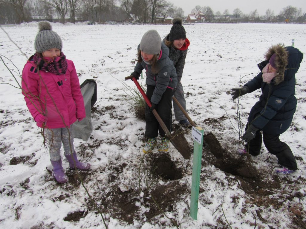 Vor zwei Jahren war es, als Handruper Schülerinnen und Schüler in Langen bei der Anpflanzung eines Schulwalds mitgearbeitet haben. Wie die Fotos zeigen, waren die äußeren Bedingungen nicht gerade einladend. Danke an alle Beteiligten für den “echten” Einsatz, den wir hier mit einigen Fotos würdigen wollen: