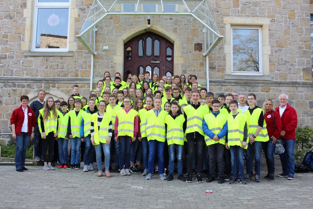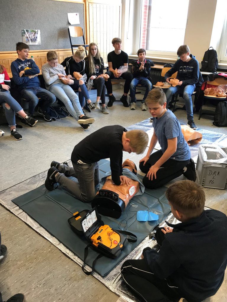 Wie in jedem Jahr fand am Montag, dem 08.04.2019, der Erste-Hilfe-Kurs für den Jahrgang 8 statt. Dieser begann am ersten Ferientag um 8 Uhr und endete um 15.30 Uhr. Insgesamt nahmen 85 Schülerinnen und Schüler teil. In vier Gruppen lernten wir die verschiedenen Methoden, einem Verletzten zu helfen. Besonderer Wert wurde auf die Reanimation,die Versorgung von Wunden, den Wärmeerhalt und die Krankheiten, wie zum Beispiel Herzinfakte oder Schlaganfälle, gelegt.