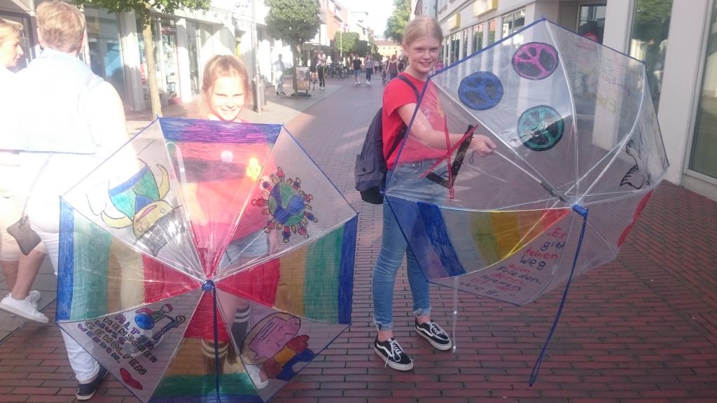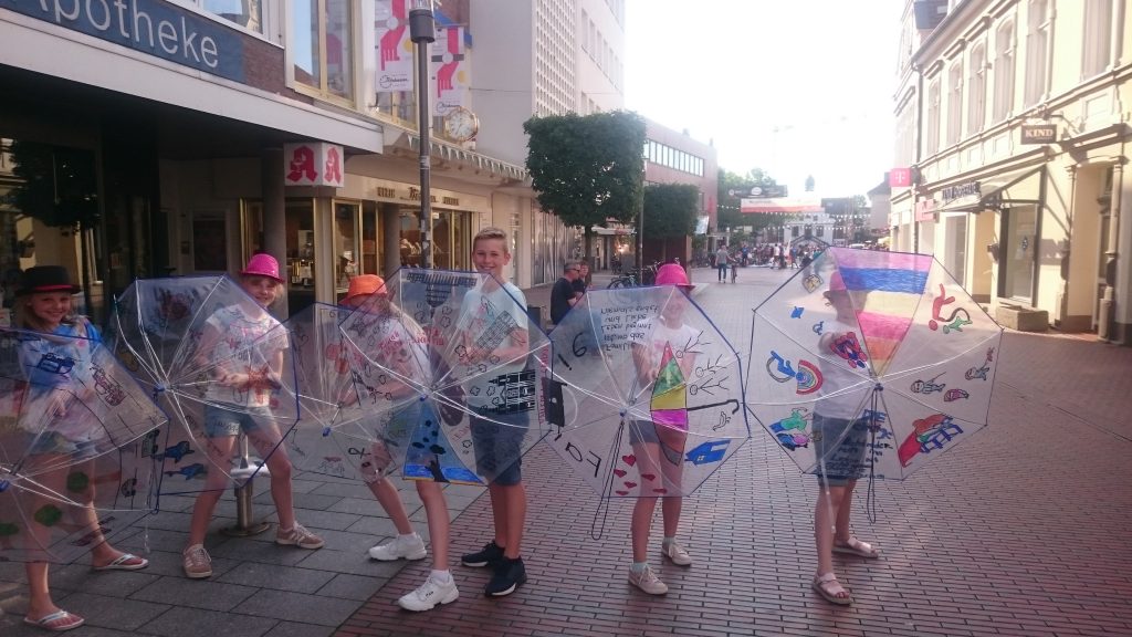 Das Leoninum nimmt mit dem Schülerprojekt “Beschirmt, beschützt, glücklich” teil. Unter der Leitung von Herrn Lang wurde ein kleines Theaterstück mit dem Titel “Wenn wir warten – Szenen vom Stehen im Regen” erarbeitet. Schülerinnen und Schülern aller Jahrgänge haben mit den Kunstlehrerinnen Frau Schlüter-Zech, Frau Kreimer, Frau Reckers und Frau Meemann eine “Installation mit Schirmen” vorbereitet, die über die gesamte Innenstadt Lingen verteilt zu sehen ist.