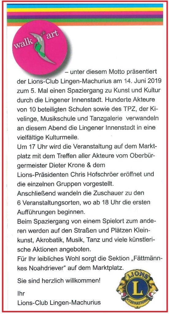 Am Freitag, dem 14.06.2019, ab 17°° Uhr, findet rund um den Lingener Marktplatz das Schüler-Kultur-Festival “Walk’n Art” statt.