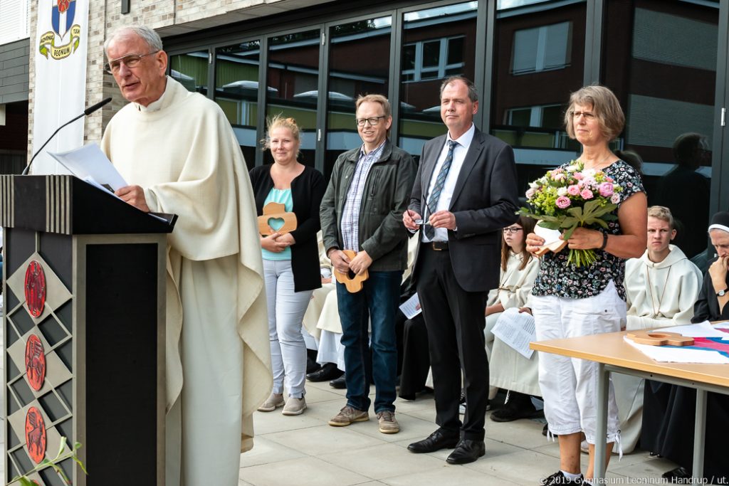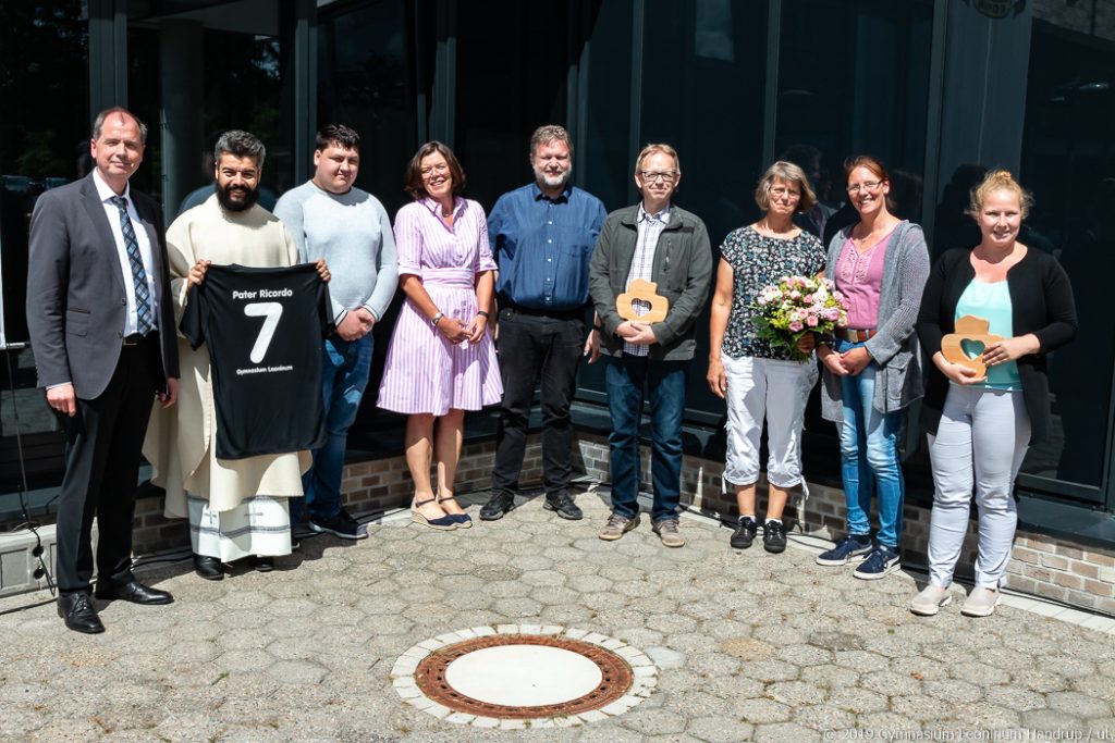 Zu den traurigen Pflichten am Ende eines Schuljahres gehört es, sich von den MitarbeiterInnen zu verabschieden, die die Schule verlassen werden. In diesem Jahr waren das Frau Havermann, Frau Schweins (Refektorium), P. Ricardo und Herr Matzki. Schulleiter Hanneken bedankte sich bei allen für ihre vielfältigen Dienste. Dem Dank schlossen sich Schüler-, Mitarbeiter- und Elternvertreter gerne an, ebenso wie P. Rektor Hülsmann für das Herz-Jesu-Kloster.