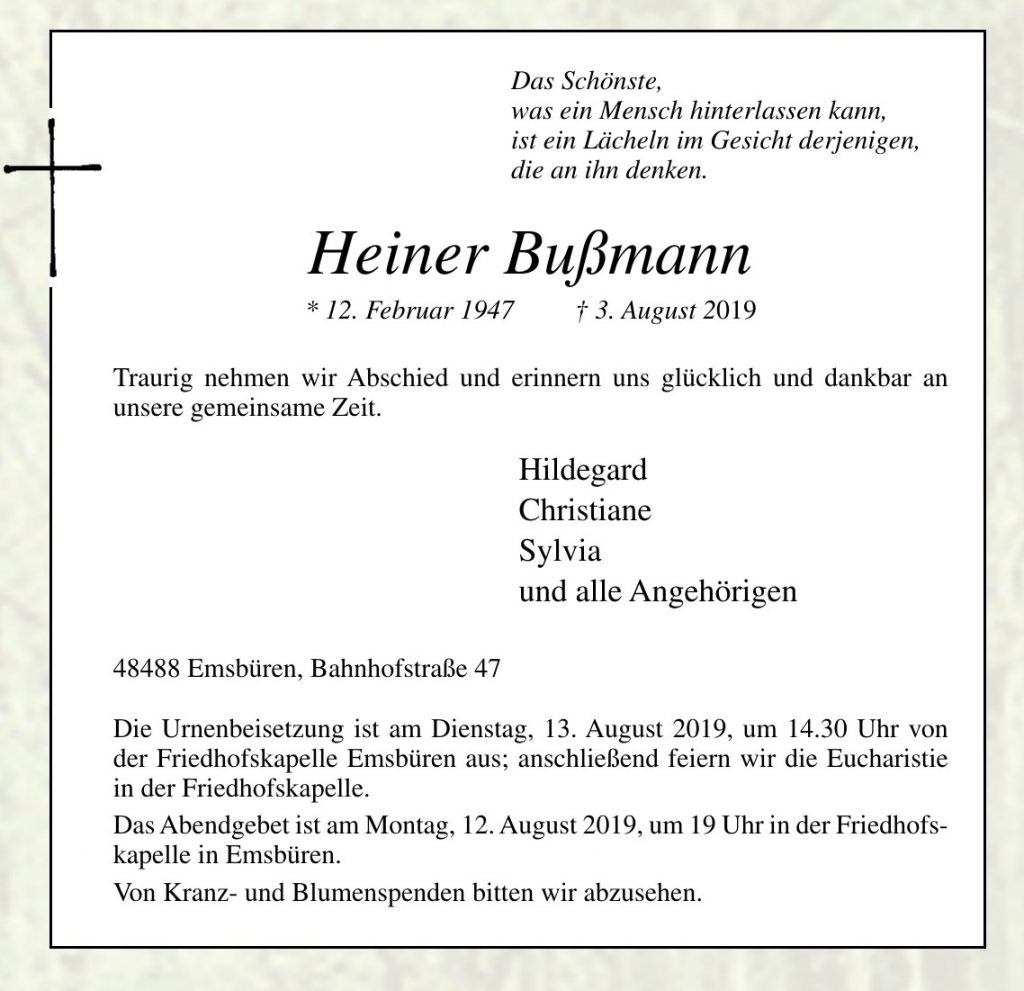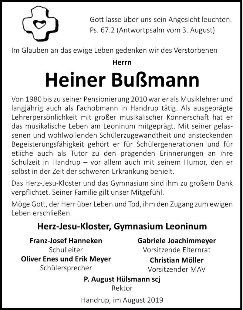 Am vergangenen Sonnabend verstarb unser ehemaliger Musiklehrer Herr Heiner Bußmann. Kloster und Schule trauern gemeinsam mit der Familie um einen Kollegen, der über viele Jahre das “musikalische Gesicht” Handrup war.