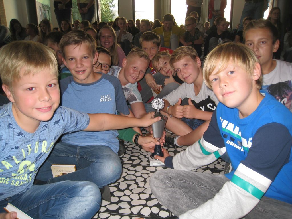Auch an anderen Stellen in der Aula herrschte gute Laune, als die Pokale für die Sieger der Sportwettkämpfe am Ende des vorigen Schuljahres verteilt wurden: