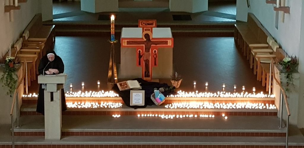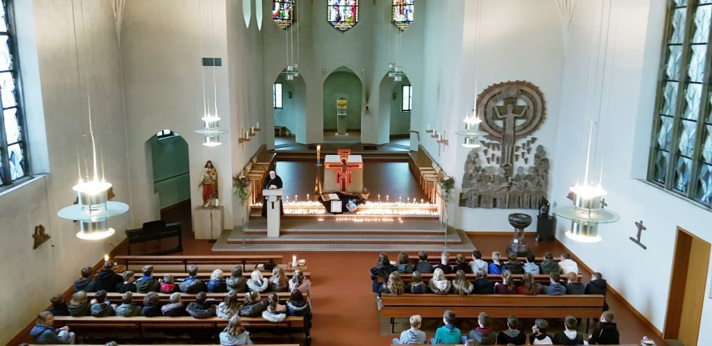 Am Freitag, dem 1. November, fanden in der Handruper Klosterkirche Allerheiligen-Gottesdienste für die Schulgemeinschaft des Leoninums statt. Im Rahmen einer Aktion entzündeten die Schülerinnen und Schüler Teelichter, die sie auf den Stufen zum Altarraum abstellten.