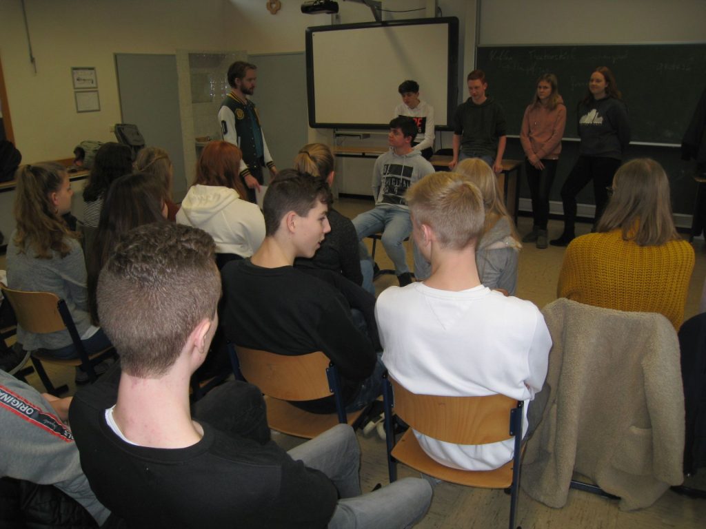 Im Rahmen der Partnerschaft zwischen dem Gymnasium Leoninum und dem Theater Osnabrück besuchen die Jahrgänge 10 und 11 das Theaterstück “Kafka” in Osnabrück. Zur Vorbereitung auf den Theaterbesuch gaben heute vier Theaterpädagogen den Schülerinnen und Schülern eine Einführung in das Stück.