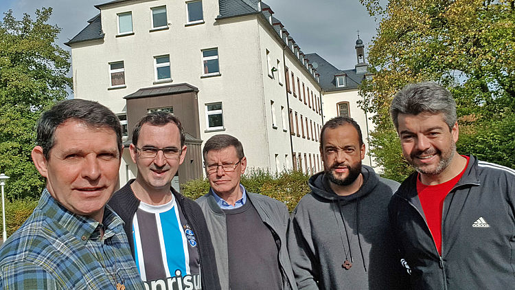 Schon P. Dehon (auf dem Foto links mit Missionaren für den Kongo) entsandte deutsche Herz-Jesu-Priester als Missionare u. a. nach (Süd-)Brasilien. Deshalb gehörte Südbrasilien zunächst zur deutschen Ordensprovinz der Herz-Jesu-Priester. Am 25. April 1934 schließlich wurde die Südbrasilianische Provinz von der Deutschen Ordensprovinz abgetrennt und selbständig. Und was hat das nun mit Handrup zu tun? Ganz viel, denn mittlerweile – seit einigen Jahren – kommen wiederum südbrasilianische Herz-Jesu-Priester nach Deutschland und arbeiten u. a. in Handrup, wo das Leoninum sehr, sehr viel von der Internationalität des Ordens profitiert.