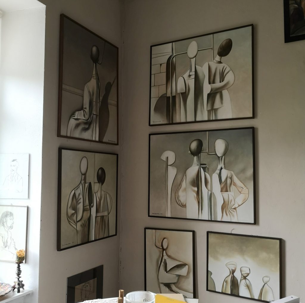 Die Bilder, die hier zu sehen sind, wurden von dem Künstler Friedrich Swoboda gemalt und sind zwischen 1983 und 1985 entstanden. Swoboda malte diese zu einer Zeit, in der gerade eine künstliche Ernährung nur durch Pillen im Gespräch war. Vielleicht wollte er durch die Rohre eine gewisse Abhängigkeit an diese darstellen? Die Menschen, die zu erkennen sind, können nicht von den Rohren weg und fühlen sich von ihnen gefangen. Ihre Freiheit ist bedroht.