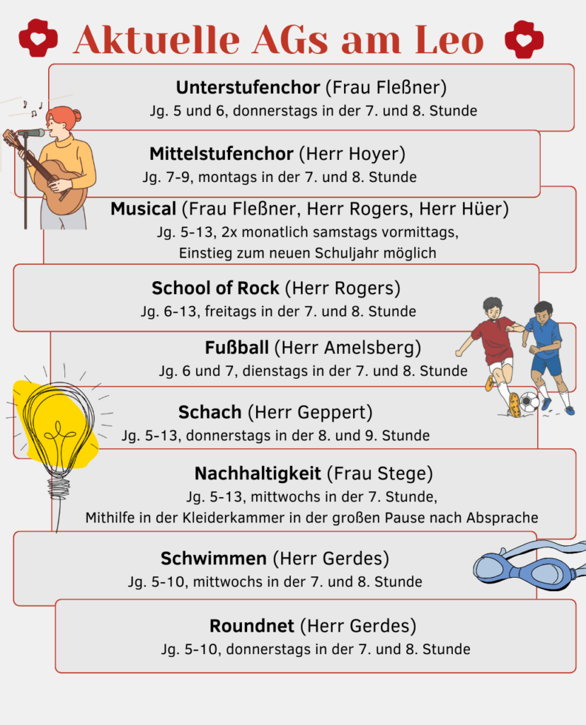Hier findet ihr noch einmal eine kompakte Übersicht über unsere angebotenen AGs sowie eine Aufstellung der wichtigsten Informationen: