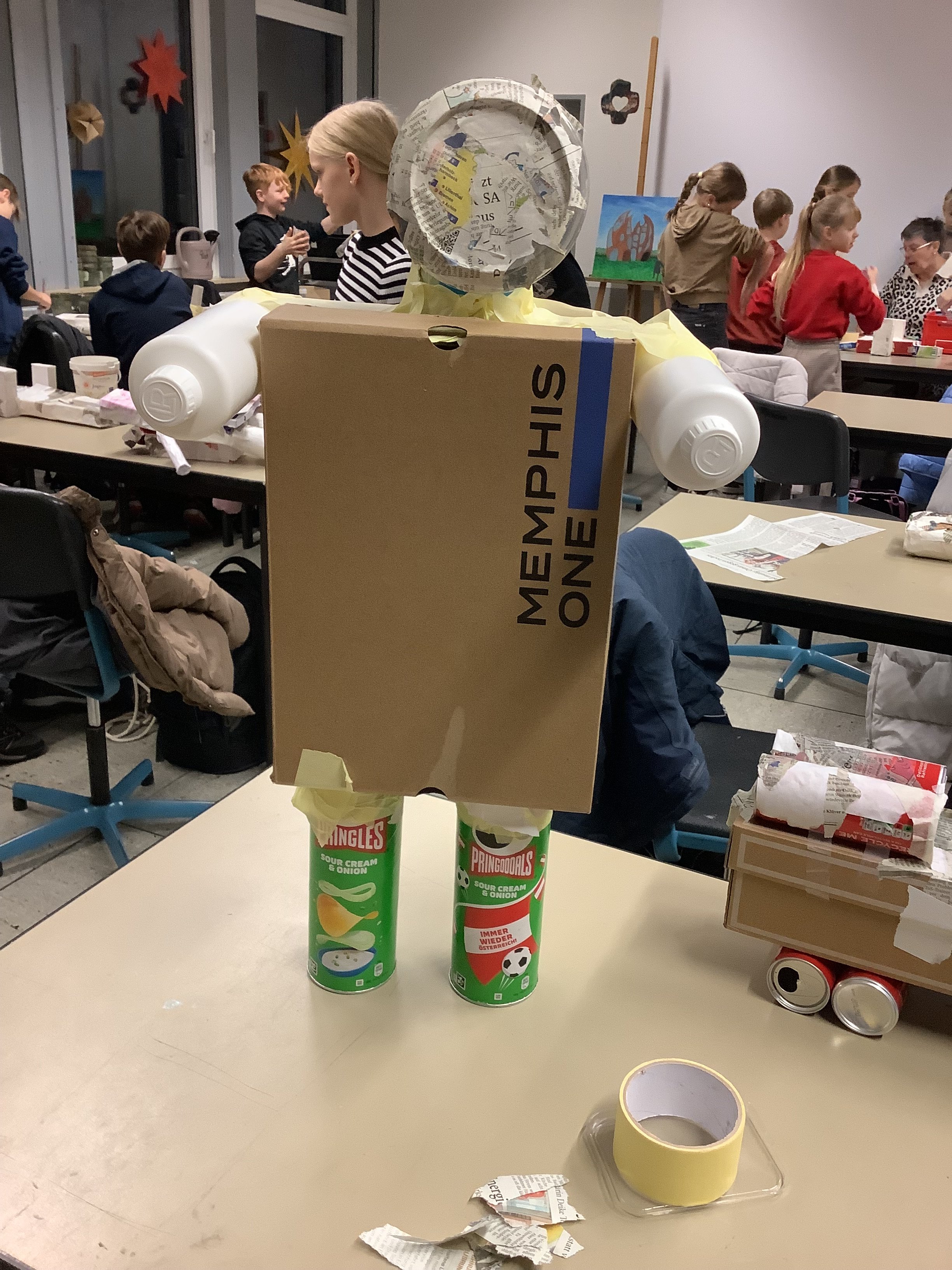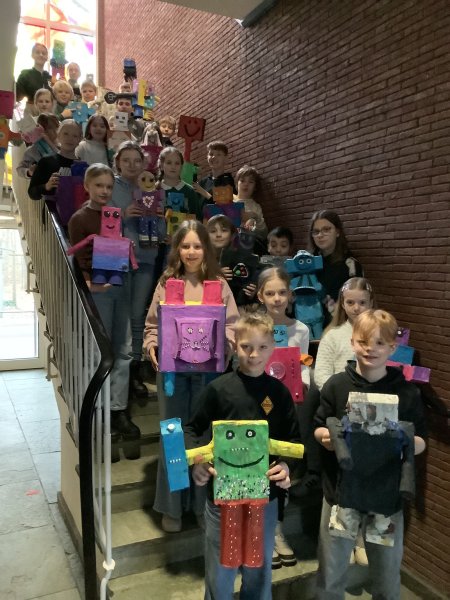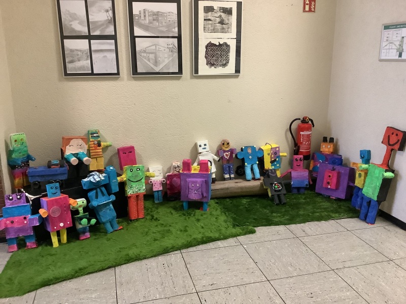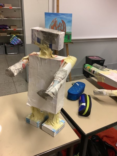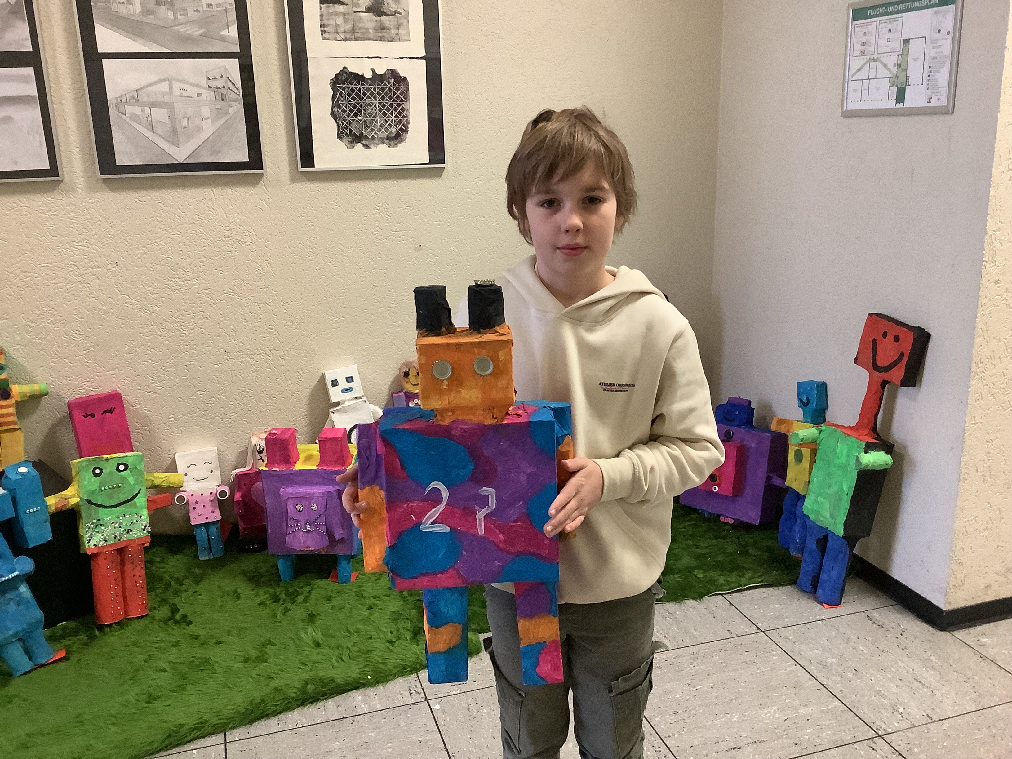 Im Sinne eines fächerübergreifenden Unterrichts fand Hugo auch im Kunstunterricht einen Platz: Die Schüler/innen der Klasse 5d konnten dort selbst (unter Anleitung von Frau Meemann) einen Roboter gestalten, den sie dann mit nach Hause nehmen können!