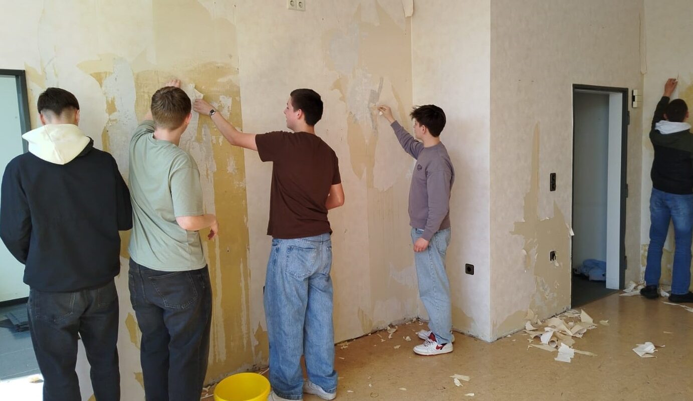 Konzentrierte Atmosphäre, allerdings nicht auf den Unterricht: Im Gymnasium Leoninum Handrup sind gestern (28.04.2025) die Arbeiten zur Renovierung des Besprechungsraums für die Schulpastoral gestartet. Zahlreiche Schülerinnen und Schüler nutzten ihre Frei- oder Vertretungsstunden freiwillig, um in dem rund 25 Quadratmeter großen Raum die alten Tapeten zu entfernen; unter ihnen auch Elke Strüwing als Leiterin der Schulpastoral und Pater Paulo Henrique SCJ aus dem Team.
