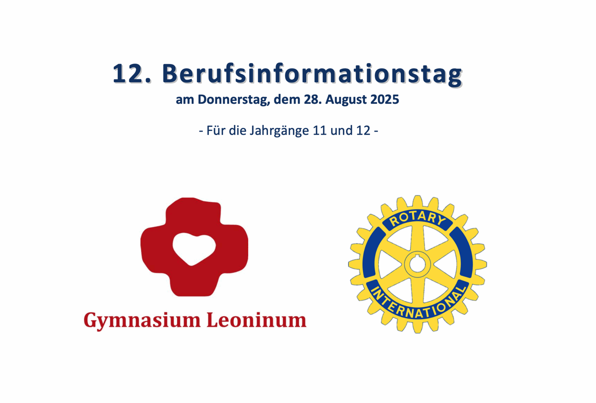 Am Donnerstag, dem 28. August, richteten wir in Zusammenarbeit mit dem Rotary-Club Lingen am Leoninum den 12. Berufsinformationstag für die Oberstufe aus, der unseren Schülerinnen und Schülern der Jahrgänge 11 und 12 die – in nicht allzu weiter Ferne liegende – Berufswahl erleichtern und sie in der Entscheidungsfindung für ihre zukünftige Laufbahn unterstützen soll. Zu diesem Zweck durften wir 40 Berater von 27 unterschiedlichen Institutionen und Firmen etwa aus Verwaltung, Industrie, Forschung und Handwerk an unserer Schule begrüßen und konnten unseren Schülerinnen und Schülern somit einen breiten Einblick in verschiedene berufliche Bereiche ermöglichen.