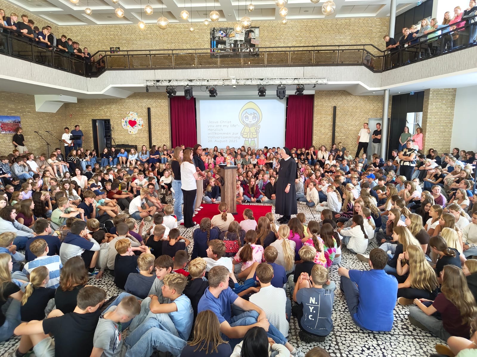 Einige Schülerinnen und Schüler, die gemeinsam mit Pater Paulo an der aufregenden Fahrt zur „Jubilee of Youth“ nach Rom teilgenommen hatten, nutzten die Gelegenheit, um der Schulgemeinschaft von ihren Erlebnissen zu berichten und einige Fotos zu präsentieren.