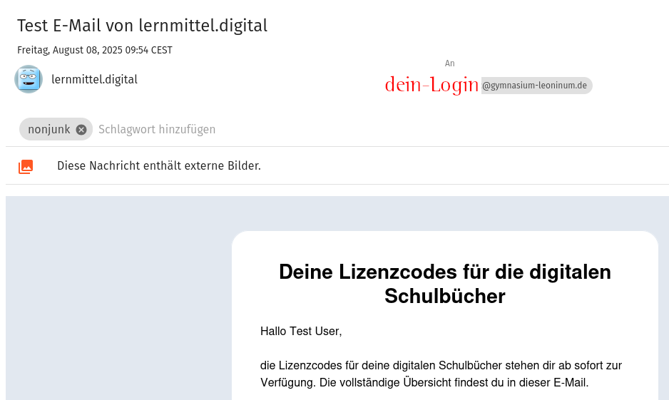 Sofern die Bestellung und Bezahlung der digitalen Schulbücher erfolgreich war, wird die E-Mail mit den digitalen Lizenzen am Wochenende vom 15. bis 17. August an Eure Schul-E-Mail-Adresse verschickt. Absender ist unser Dienstleister lernmittel.digital.