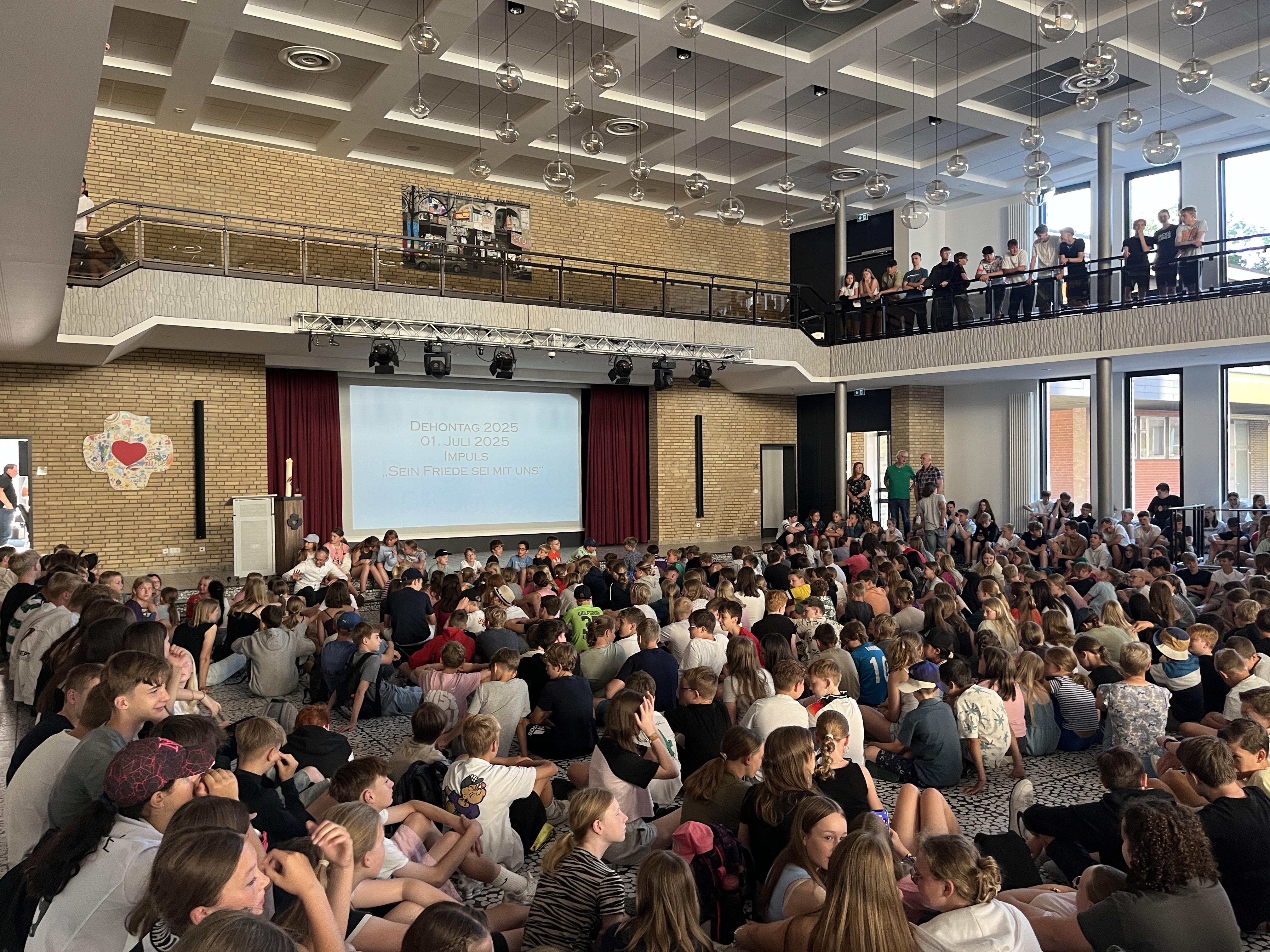 Ein besonderes Highlight des diesjährigen Dehontages war die Fotoaktion ‘Frieden’, im Zuge derer die gesamte Schulgemeinschaft auf dem Sportplatz die Form einer Friedenstaube bildete. Die Aktion verlief reibungslos und es entstanden einige wirklich tolle Fotoaufnahmen.