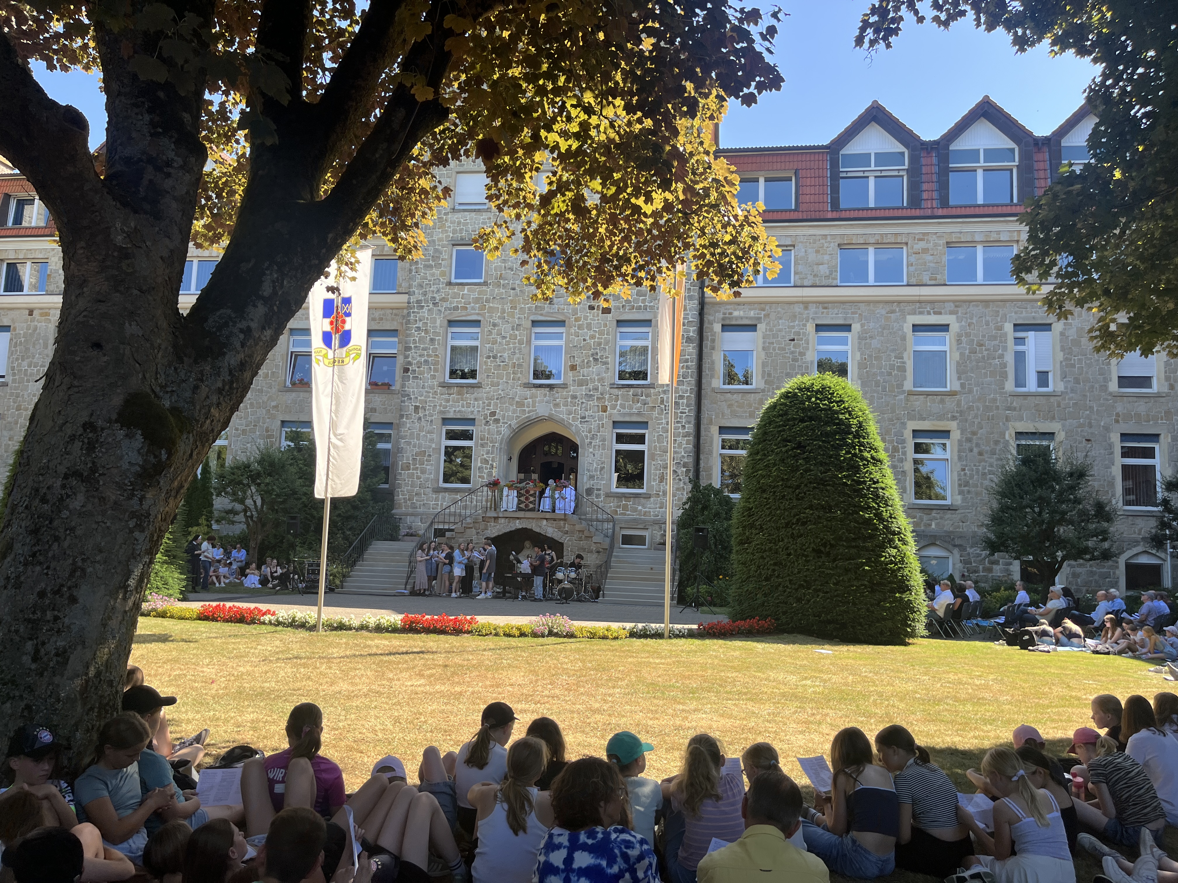 Auch den Wortgottesdienst zum Abschluss des Schuljahres konnten wir draußen, an einem schattigen Plätzchen vor dem Kloster, zusammen feiern.