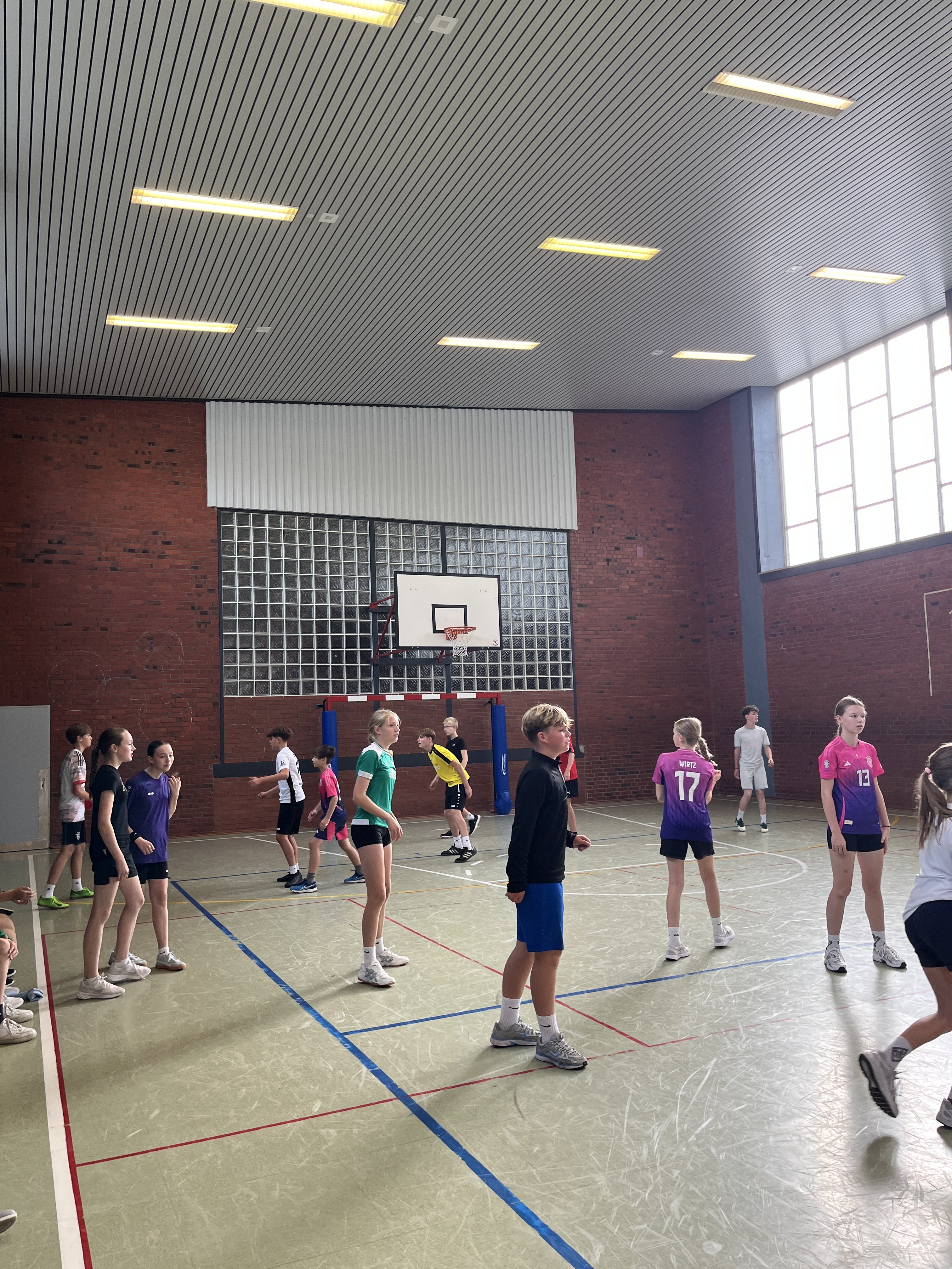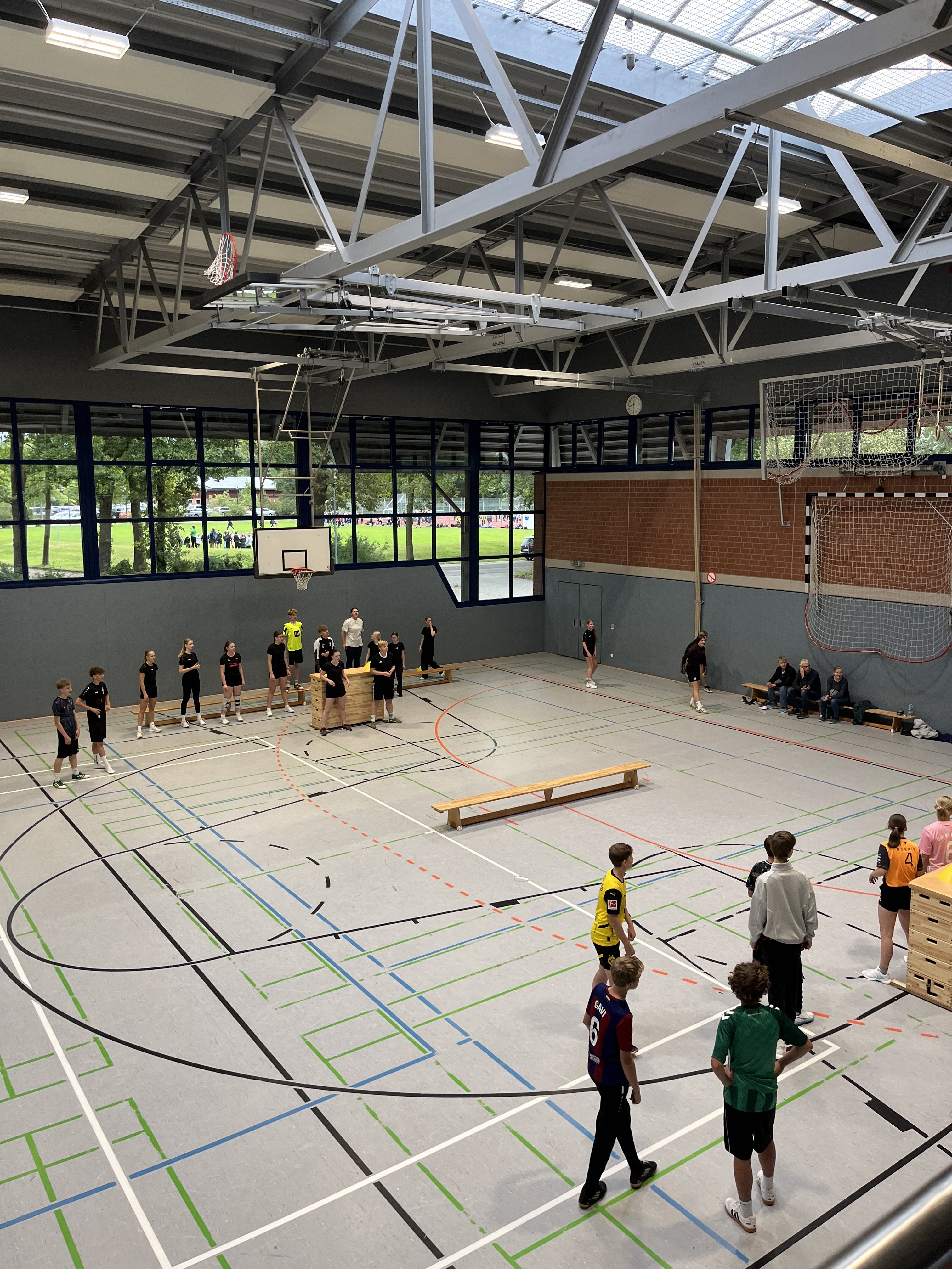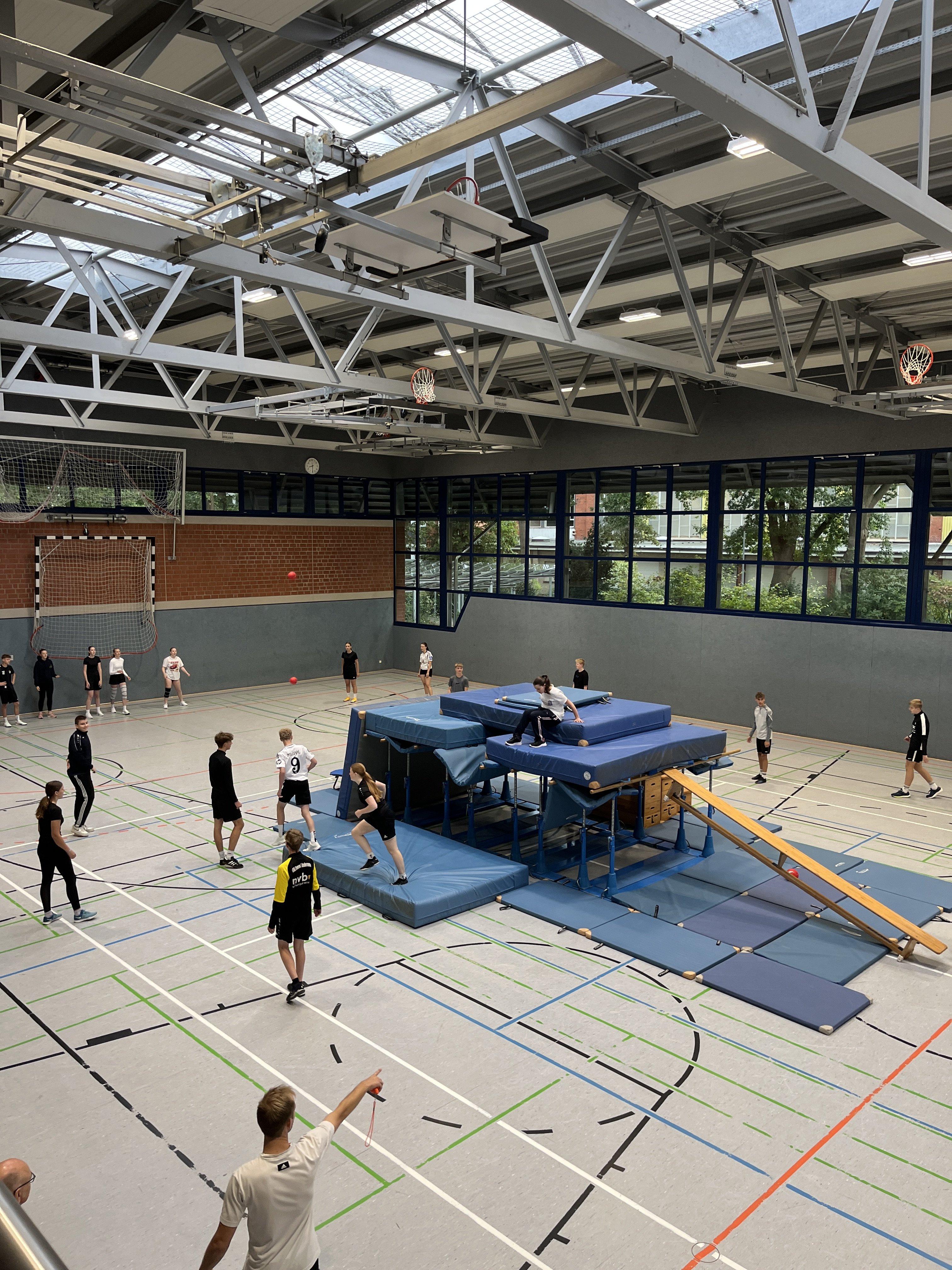Der Jahrgang 8 nutzte die Alte Sporthalle für ein jahrgangsinternes Turnier im „Zweierball Extreme“. Ehrgeizig und zielorientiert gingen die achten Klassen zur Sache, während sie durch die enge Halle liefen, warfen und riefen. Für den Jahrgang 9 wurde ebenfalls ein „Indonesisch Völkerball“-Turnier ausgerichtet, allerdings im kleineren Teil der Neuen Sporthalle. Hier wurden die Grundlagen der Unterstufe mit der erweiterten Anwendung taktischer Mittel verfeinert und somit ein toller sportlicher Wettkampf geboten. Nebenan, im größeren Teil der Neuen Sporthalle, sprangen, rannten und klingelten die Zehntklässler zu ihren Punkten im actiongeladenen „Matterhornball“. Um den Berg aus Barren und Matten zu erklimmen, bevor die defensive Mannschaft dies durch Abwerfen verhindern kann, braucht es eine große Portion Mut, Schnelligkeit und taktische Überlegungen innerhalb der Klasse.